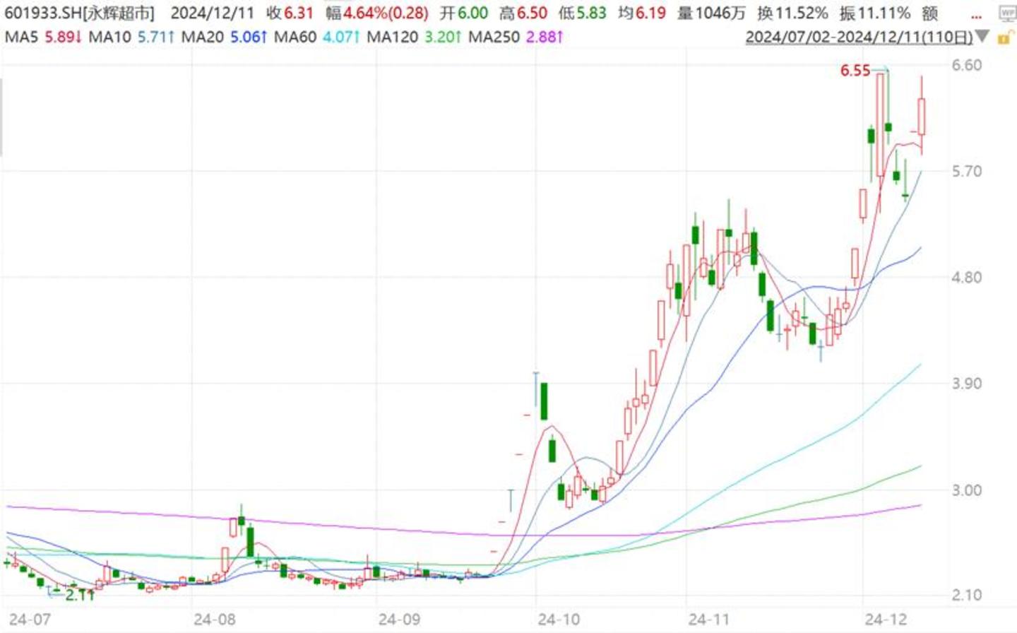 于是,永辉超市开启了本轮爆发行情,连拉数个涨停板。如果单纯是大股东易主,股价或许很快会偃旗息鼓,但恰巧碰上了A股大盘史诗级行情。