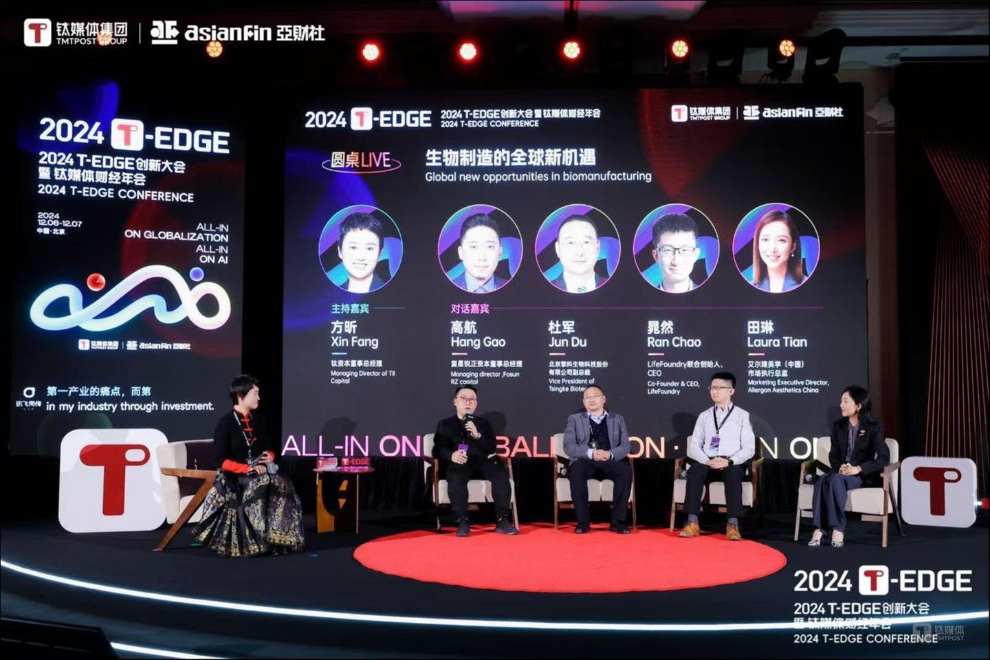 12月6日-7日,以“ALL-in on Globalization, ALL-in on AI”为主题的2024T-EDGE创新大会暨钛媒体财经年会在北京市大兴区举办,首日聚焦「生物制造“链”全球」主题,在圆桌讨论环节各位与会嘉宾就“生物制造的全球新机遇”展开对话,钛资本董事总经理方昕主持圆桌,复星锐正资本董事总经理高航述说产业投资逻辑,北京擎科生物科技股份有限公司副总裁杜军介绍AI赋能,LifeFoundry联合创始人、CEO晁然阐明中美差异,艾尔建美学(中国)市场执行总监田琳详谈应用端需求。