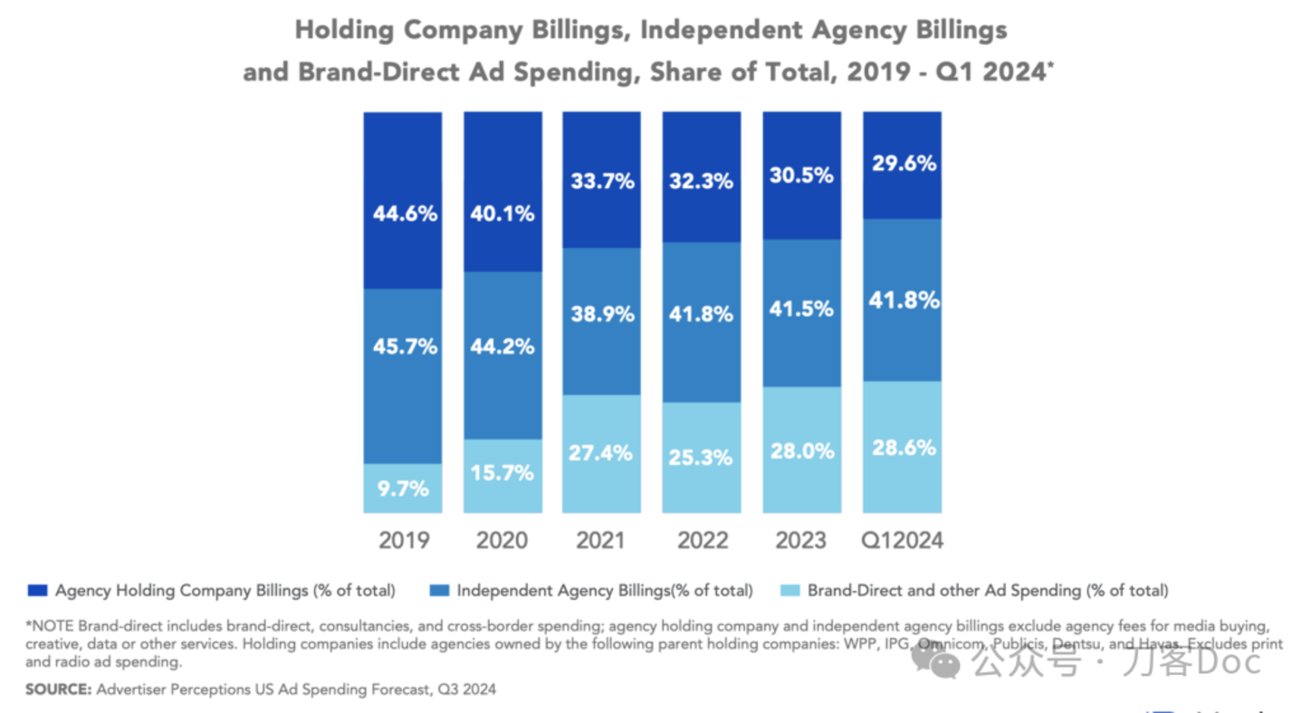 根据美国分析机构Advertiser Perceptions的数据,广告集团对全球广告支出的支配能力不断下降。全球六大广告集团2019年控制了美国44%的广告总支出,到了2024年第一季度,这一比例已经下滑到29.6%,连3成都不到了。