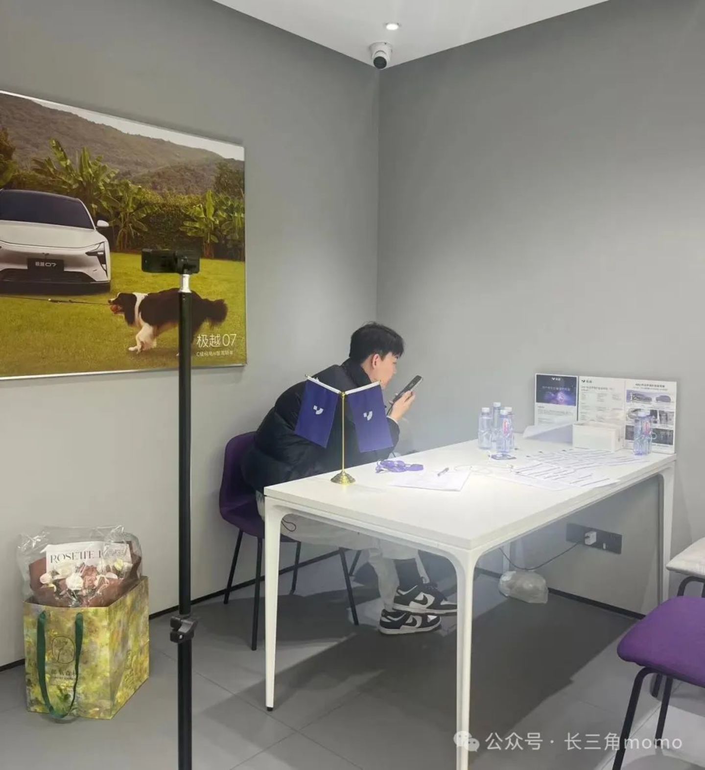 他时而把镜头对准极越唯二的两辆车,时而转移到办公室介绍起极越公司的背景。我走到店门口问他情况。他以为我来看车,热情地介绍,“车可以继续看的哈,但是被锁了,不能试驾,也看不到内饰。”