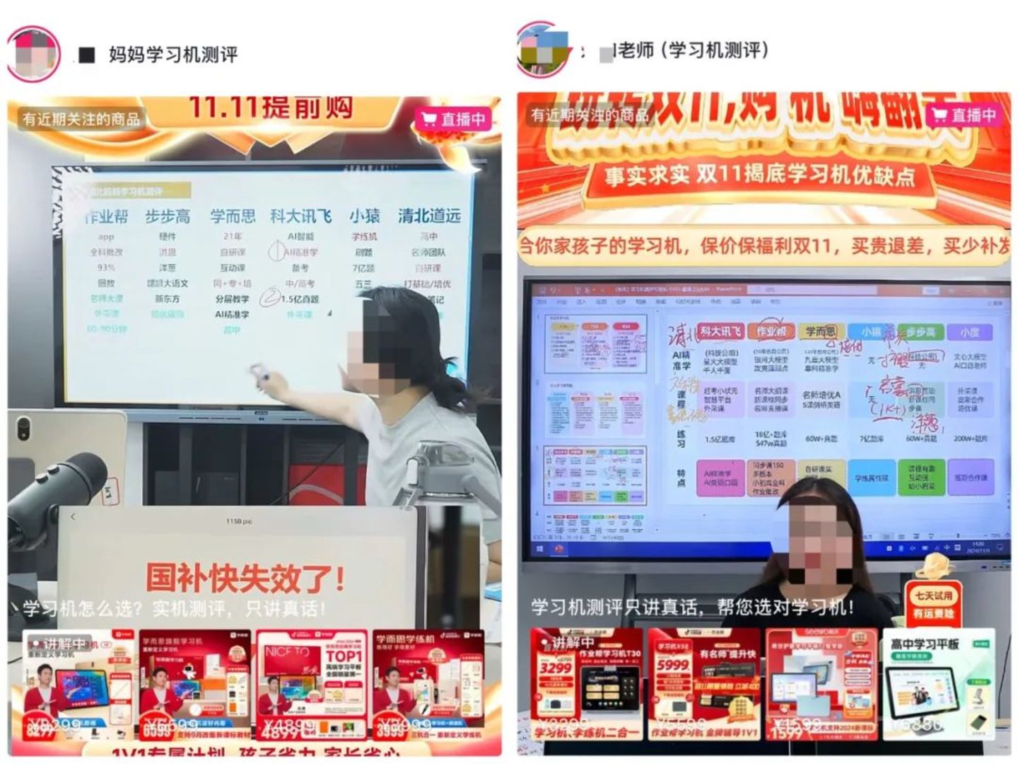 多个以“测评”为名的学习机直播间,其背景话术相似(来源:抖音截图)