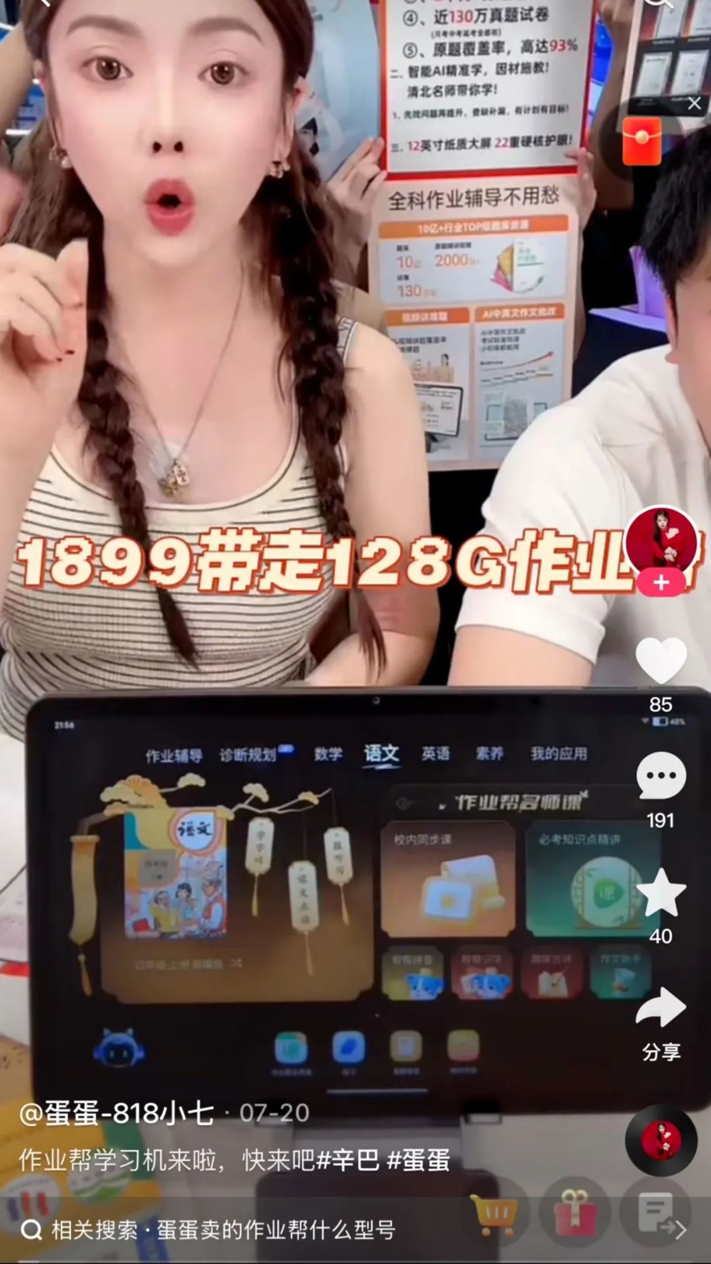 “谦妈葫芦爸”主播在推荐科大讯飞学习机的同时称,可以提供学而思的课程内容,课程将通过其开发的App每日同步更新,并通过网盘提供800T的资源。剁椒浏览发现,像这样学习机销售模式在抖音平台并不少见。