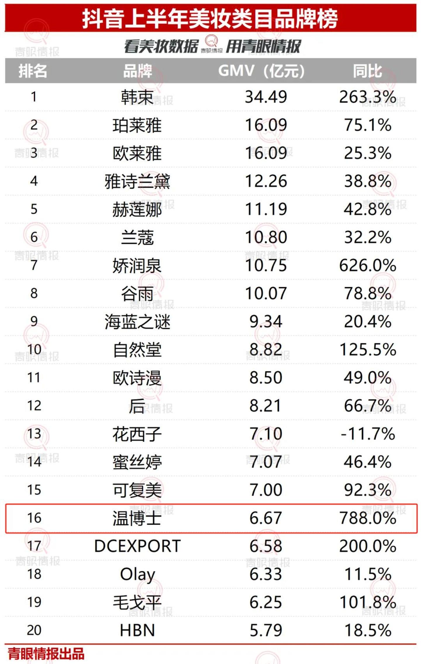以美妆产品为例,青眼情报数据显示,2024年上半年抖音美妆TOP20榜单中,成立不到一年的温博士,以788%的GMV同比增速首次进入榜单,成为增速最快的品牌。该品牌上半年GMV为6.67亿元,高于Olay、毛戈平等知名品牌。