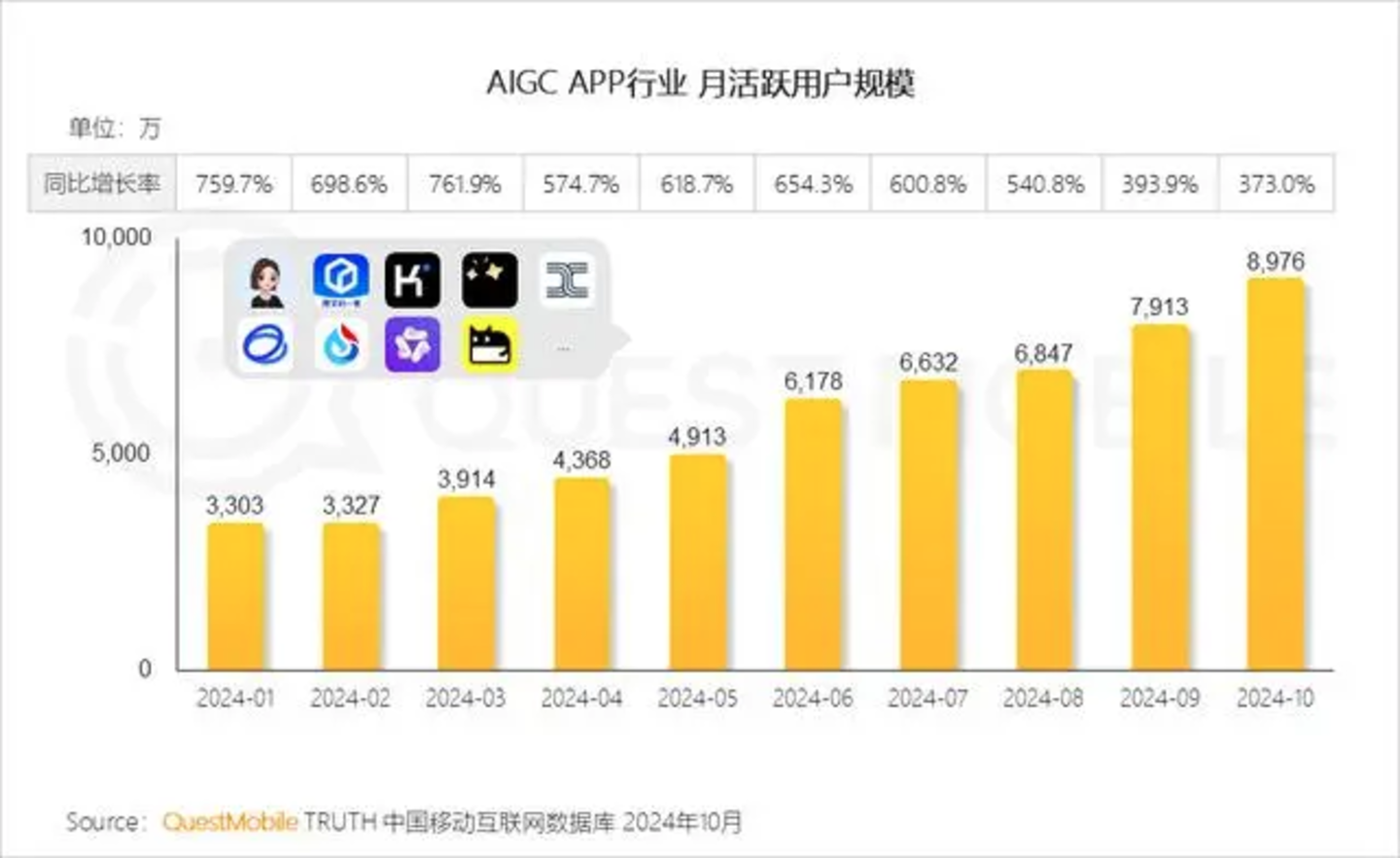 QuestMobile数据显示,2024年10月,AI原生应用行业月活跃用户规模达到8976万,同比增长373.0%。