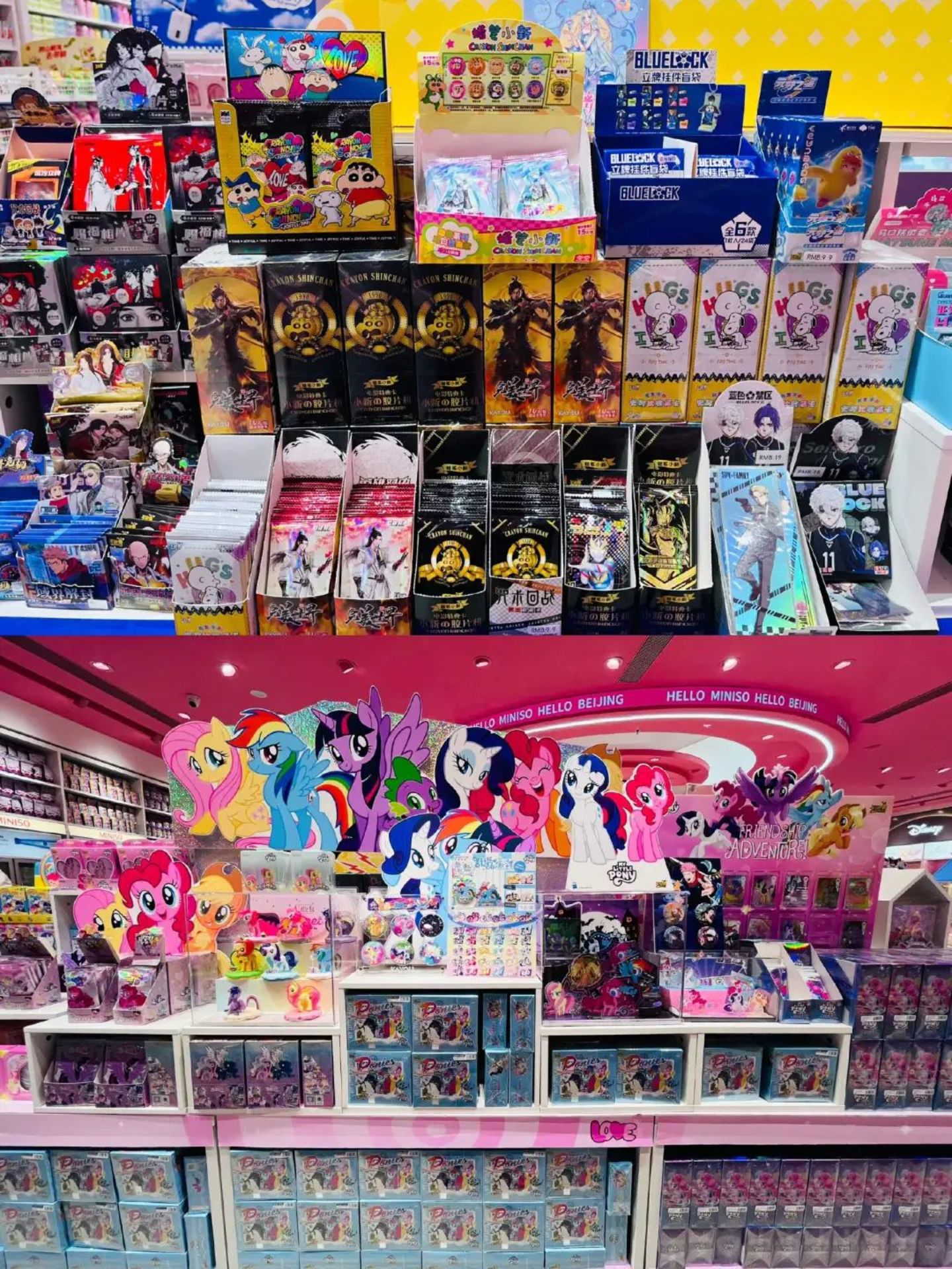进门迎面就是一排亚洲人气偶像BlackPink的周边,包含几十款联名周边,包括手机挂件、T恤抱枕、限量小卡和插卡立牌等。旁边还有一个区域主要售卖谷子,IP分为两类,一类是排球少年、咒术回战、蓝色禁区等谷圈断货王,另一类是老少皆宜的经典IP,如蜡笔小新、多啦A梦、小马宝莉、奥特曼、哈利波特等。