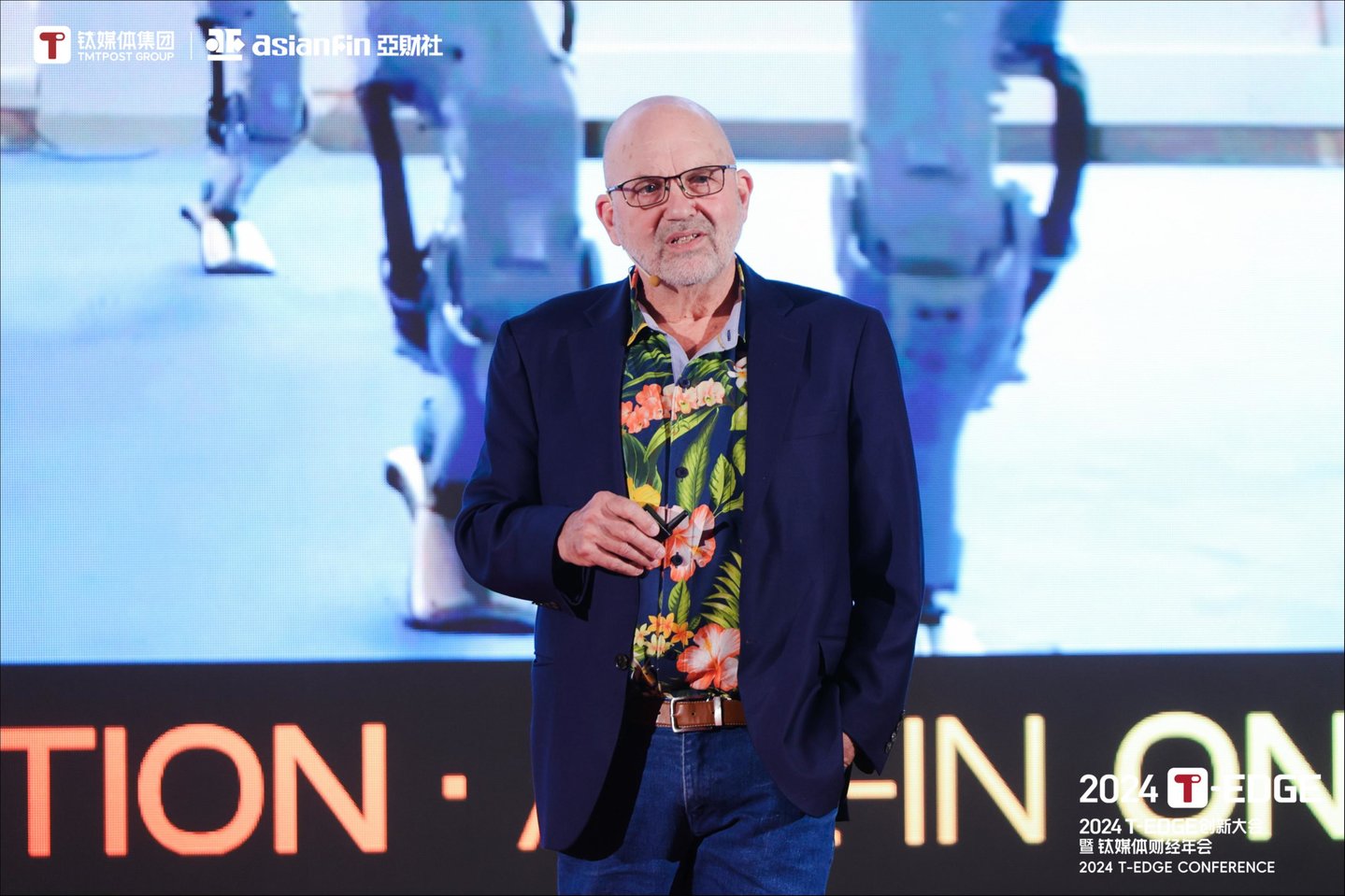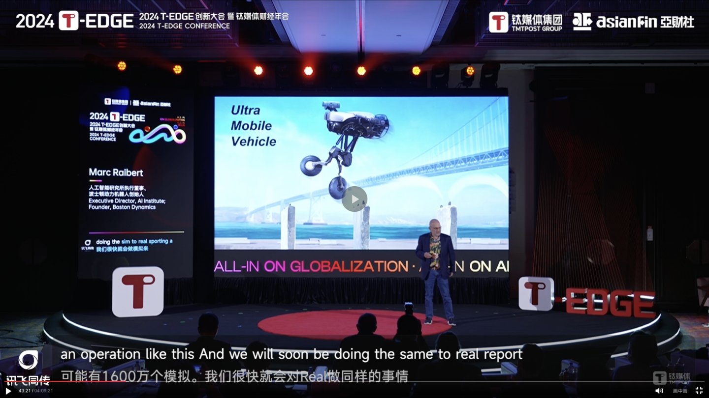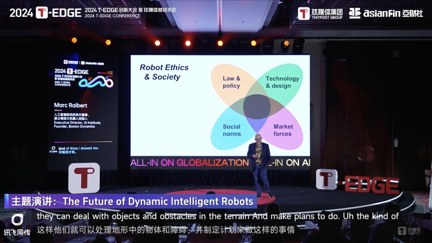 7日上午T-EDGE 全球AI论坛:All-in On AI会议上,人工智能研究所执行董事、波士顿动力机器人创始人Marc Raibert(马克·雷伯特)以“The Future of Dynamic Intelligent Robots(动态智能机器人未来)”为主题,围绕 AI、机器人和波士顿动力业务等相关话题进行演讲。