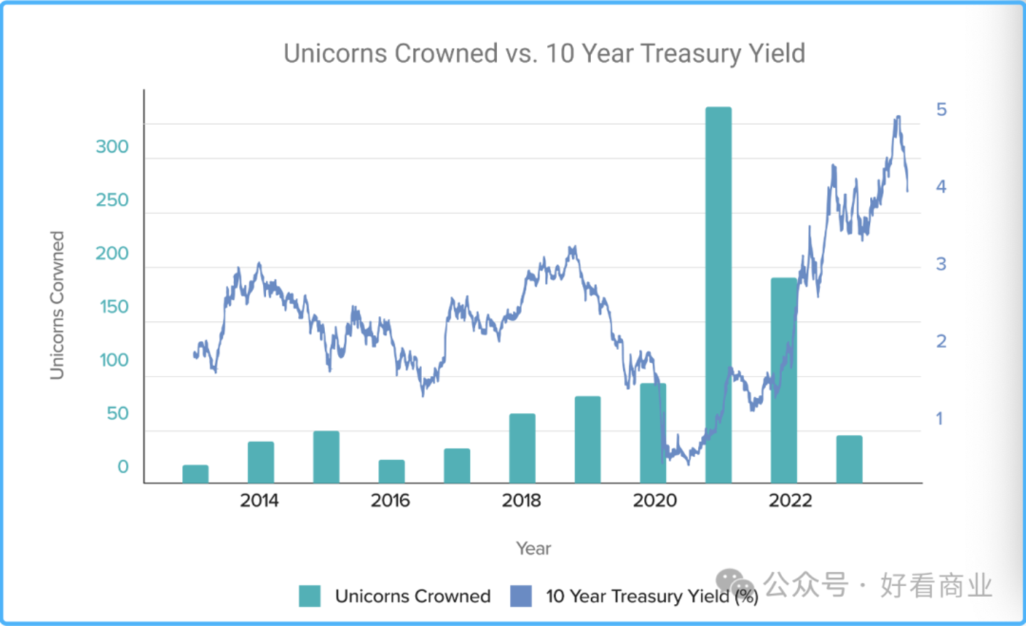 零利率催生了独角兽,也顺带催生了估值泡沫。在前文提到的牛仔基金的报告里,Aileen Lee提到,在美国当下532 家独角兽公司中,60%是零利率政策催生出的 “ZIRPcorn”。