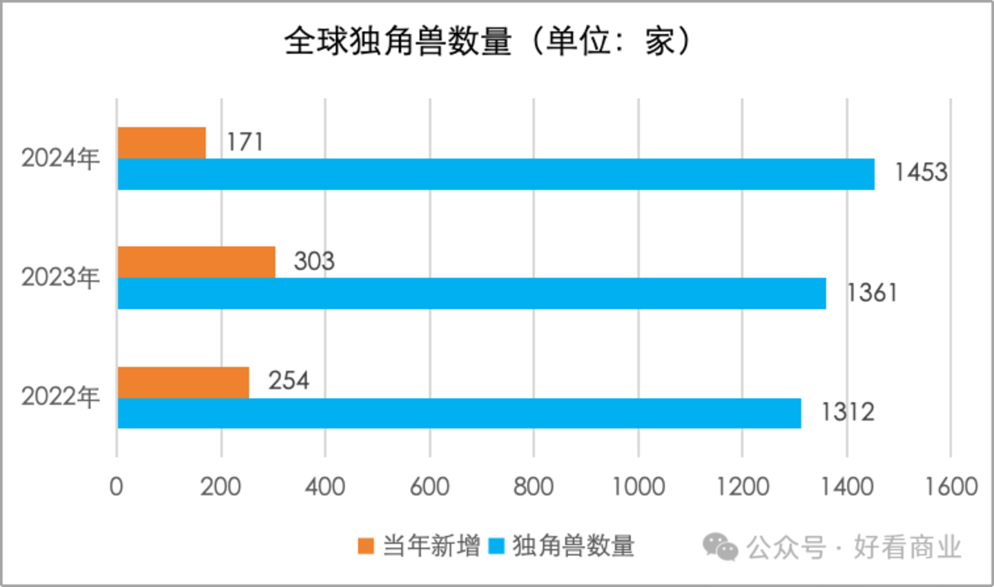 据胡润研究院每年发布的全球独角兽榜单,2024年全球独角兽企业数量达到 1453 家,其中新增独角兽是171家,而2023年全球独角兽的数量是1361家。这意味着,全球存量独角兽中有约79家在2023-2024年从榜单上消失了。