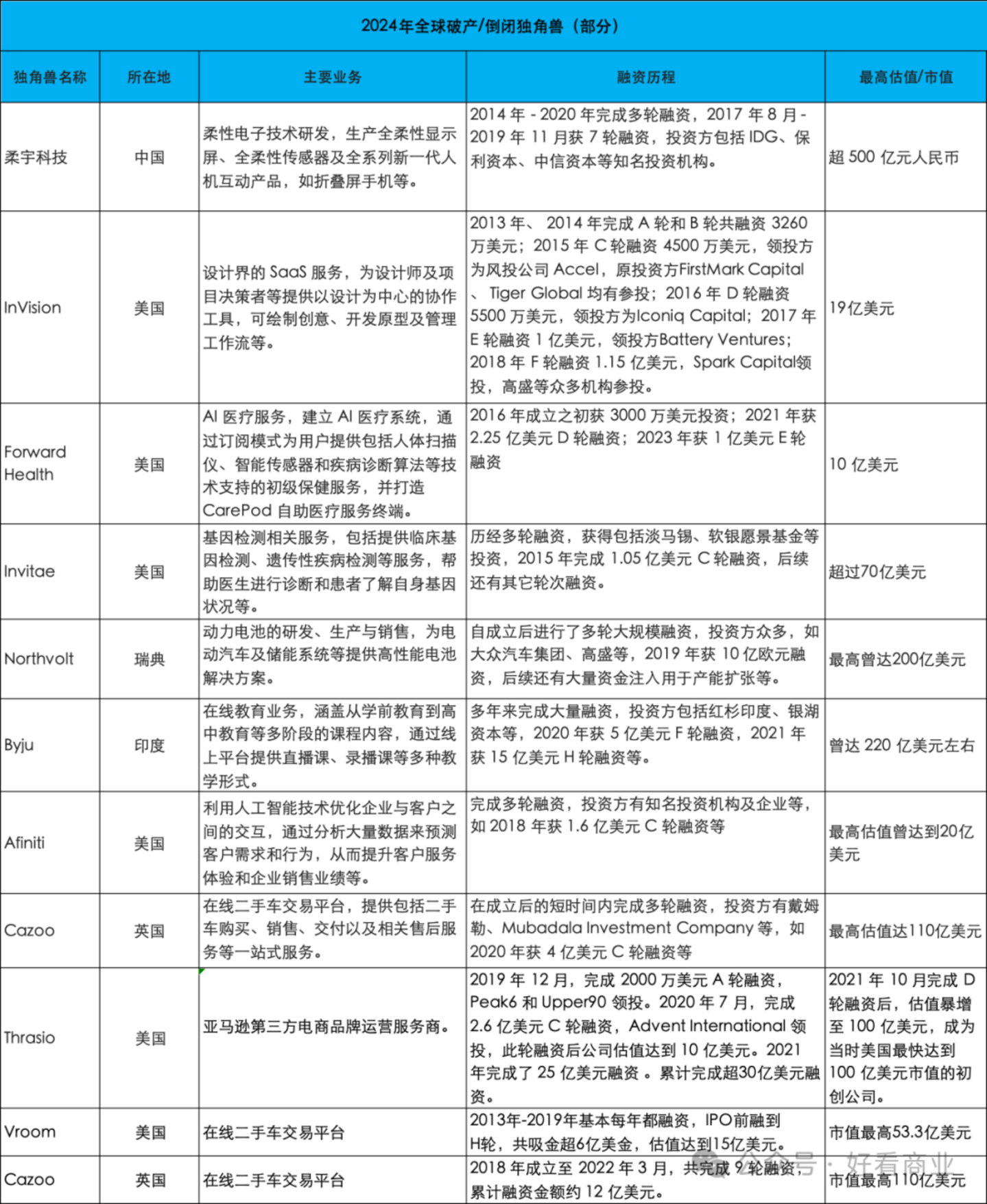 2024年11月,估值1400亿元的超级独角兽、欧洲最大的锂电池制造商Northvolt申请破产保护;9月,印度教育巨头、估值一度达到1540亿元的Byju's宣告破产。2月,亚马逊平台上最大的第三方卖家之一Thrasio正式在美申请破产;它在2021年时估值就达到700亿元,是美国崛起最快的独角兽之一。