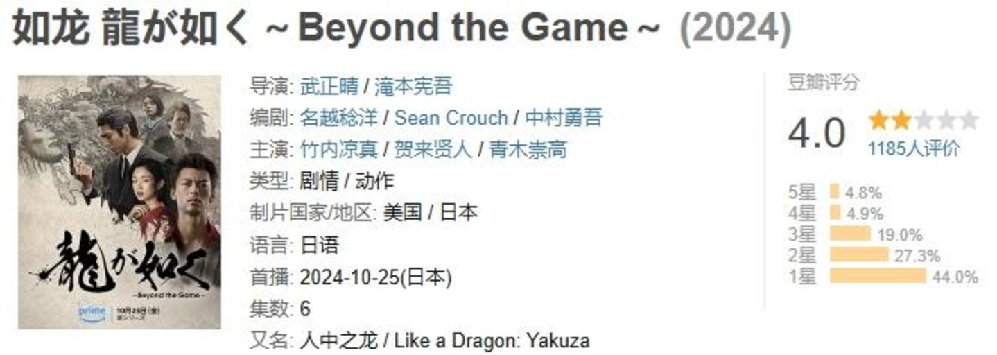 比如《如龙》烂番茄指数67%,豆瓣评分4分,演员竹内良真甚至在采访中表示自己并未玩过《如龙》系列游戏,当男主都未能深刻理解游戏精髓时,作品质量可想而知。