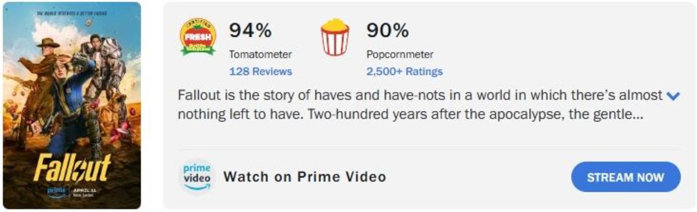 《辐射》改编自有史以来最伟大的电子游戏系列之一,烂番茄新鲜度94%,由乔纳森·诺兰执导,亚马逊 Prime Video负责制作,该剧被称为“2024最新末日废土科幻”。