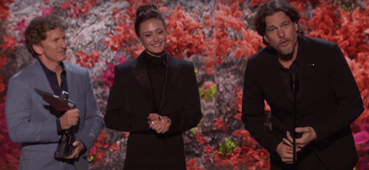 △ 主创托德·霍华德(左)、艾拉·珀内尔(中)、乔纳森·诺兰(右)登台领奖