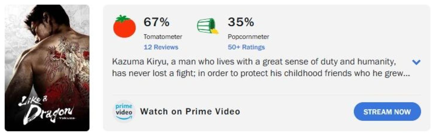 △ 《如龙》烂番茄指数67%