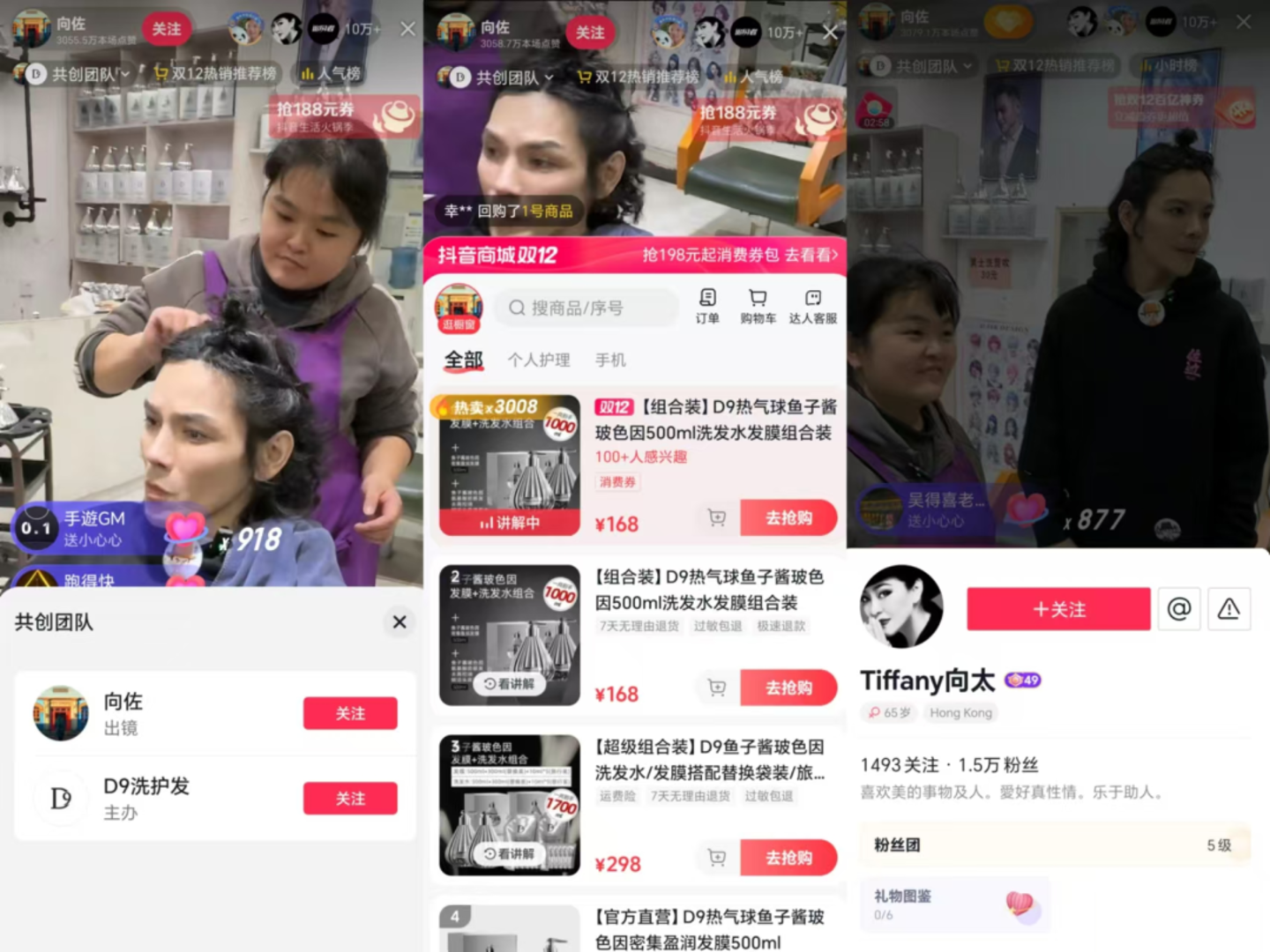 剪发是假,带货是真。据了解这场直播是向佐和D9洗发水品牌的共创,小黄车中共挂有多款D9产品。洗发过程中,晓华不断配合着向佐介绍着这款洗发水产品。这款产品也出现在向佐此前的短视频中,相关信息显示,D9抖音店铺关联芮欧(广州)化妆品有限公司,该公司成立不足2月。