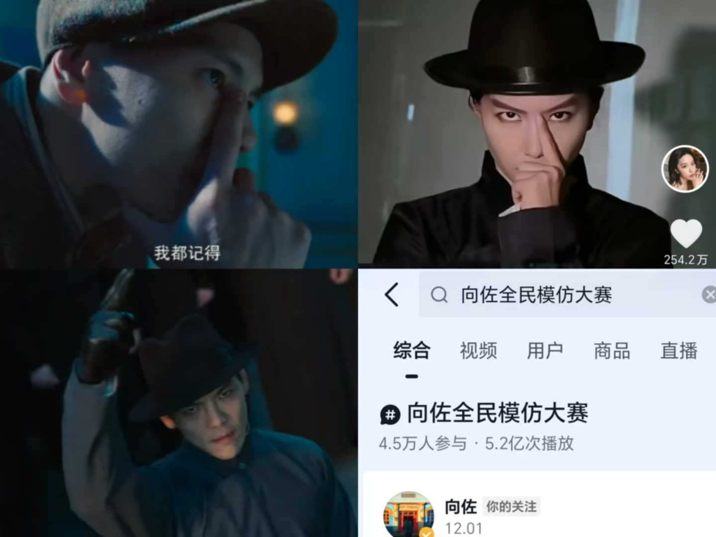 因为在电影中“摸鼻”“扇耳光”“向天宣誓”等浮夸演技,向佐被网友吐槽甚至争相模仿,热度居高不下,不仅连上36个热搜,在抖音#向佐全民模仿大赛相关视频播放量达到了5.2亿次。