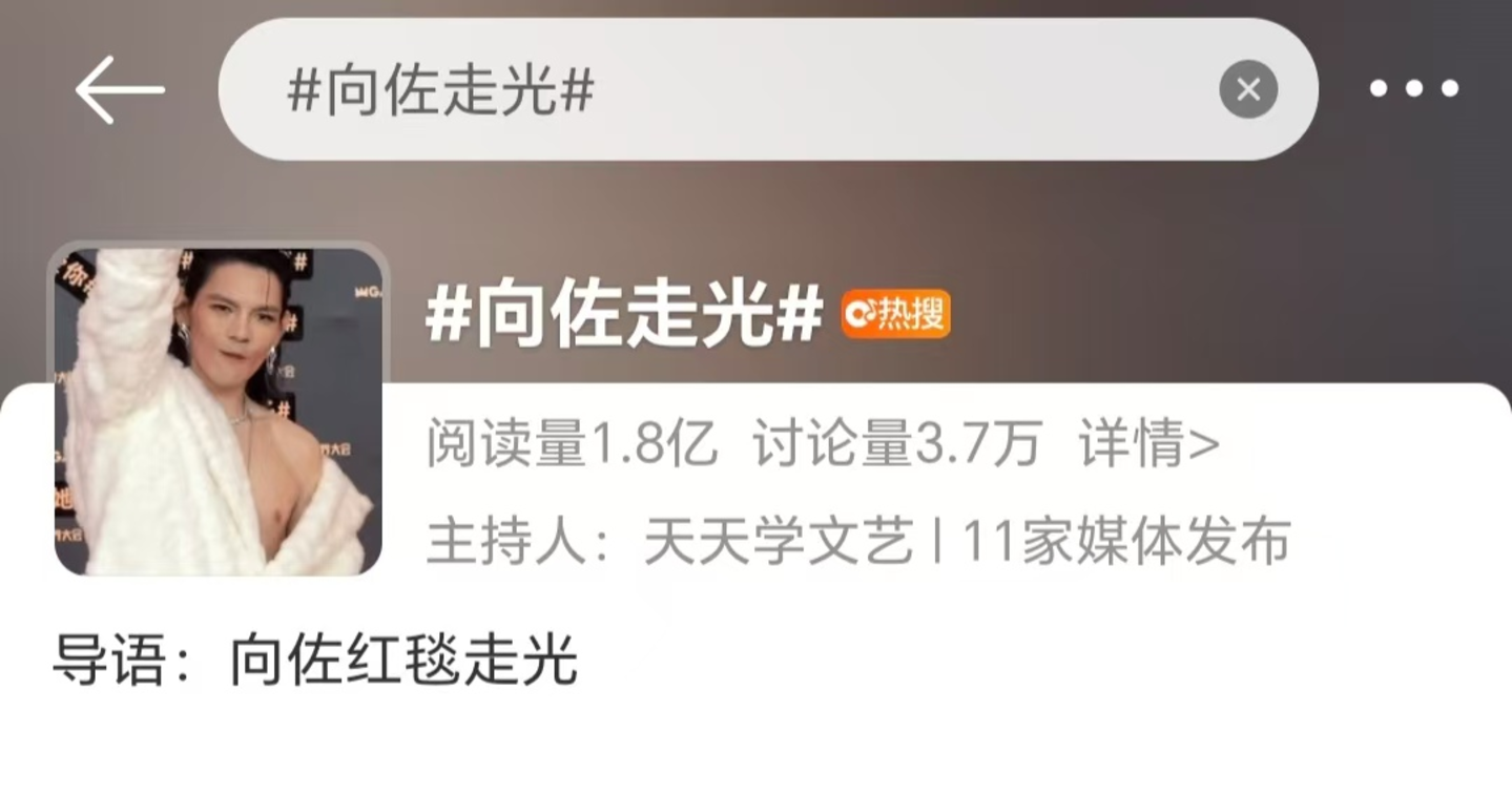 在随后的微博视界大会上,浓妆艳抹的向佐身穿深V睡袍,露背又露肩亮相红毯,在做着单手指天的动作时,身上的“睡袍”不慎滑落走光,成为当晚最大看点。当天,“向佐走光“的热门话题冲上微博热搜,斩获了1.8亿的阅读量,3.7万的讨论量,被网友调侃是“老肩巨滑”。