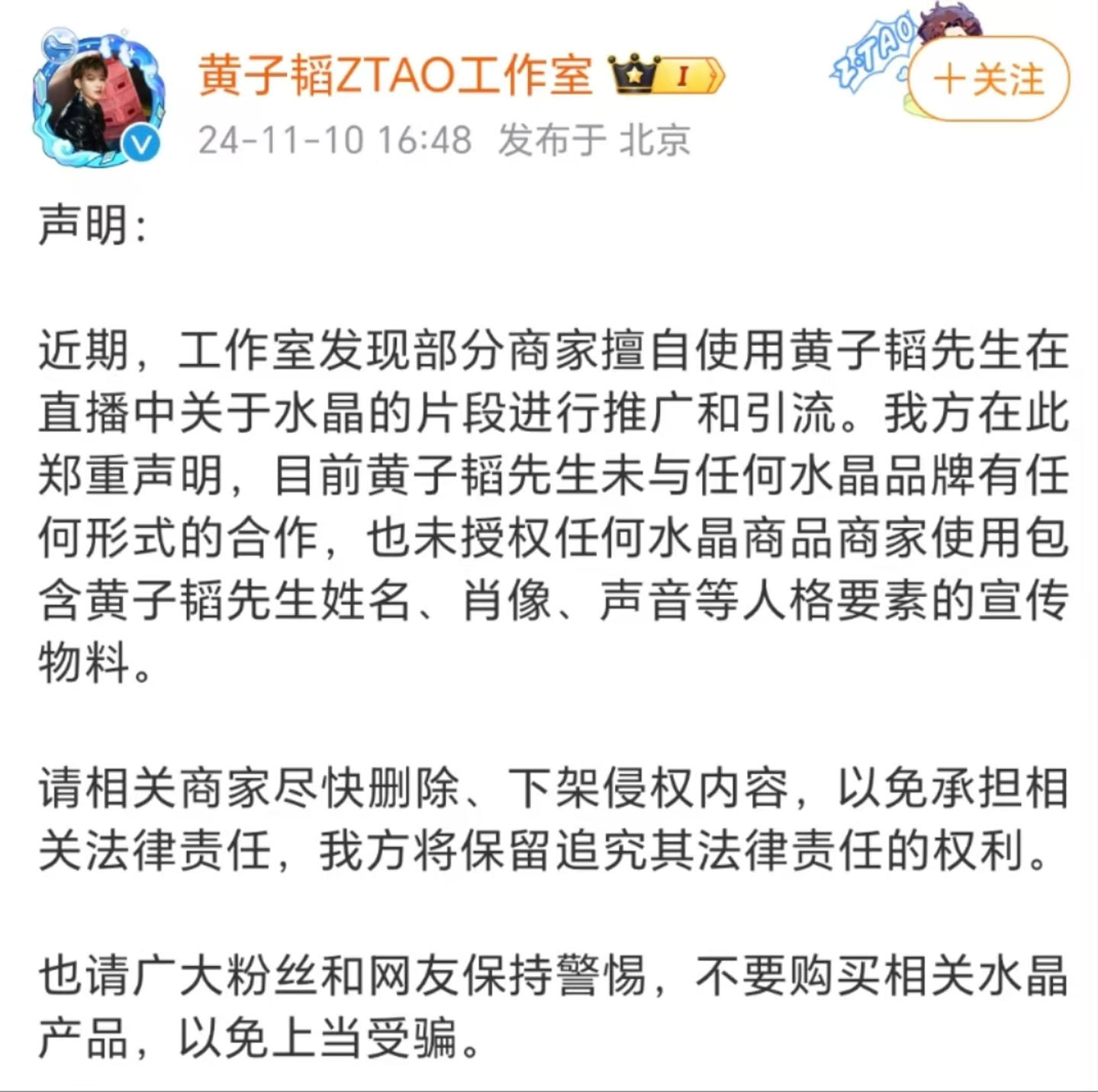 这一直播切片甚至被水晶商家当成了直播引流的工具,影响力持续扩散,黄子韬不得不在11月10日在个人及公司账号发表声明,澄清徐艺洋和黄子韬未与任何水晶品牌有合作,请相关商家删除侵权内容。