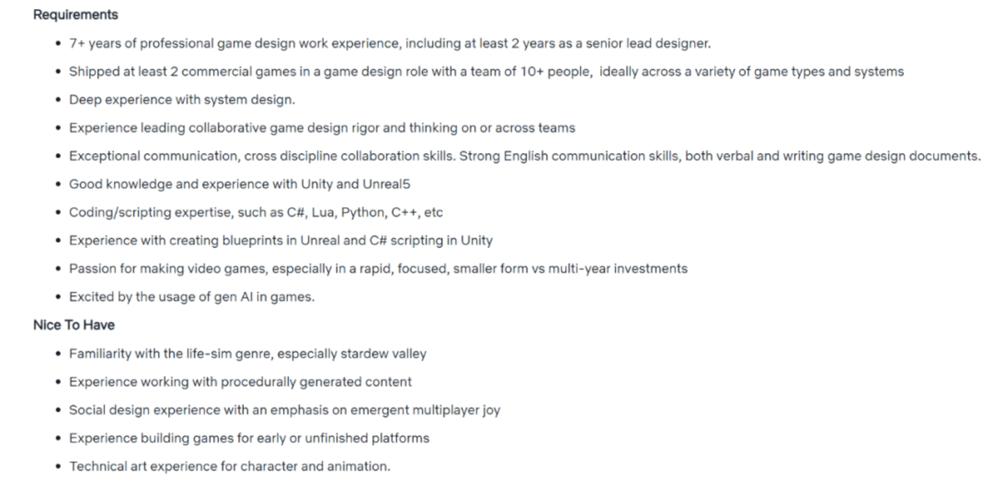 而在要求上,则提到要有7年以上的专业游戏设计经验,并至少2年担任高级主设计师,以及带领 10 人以上的团队发布过至少 2 款商业游戏。除了专业设计知识外,还要“对在游戏中使用生成式AI有兴趣”。