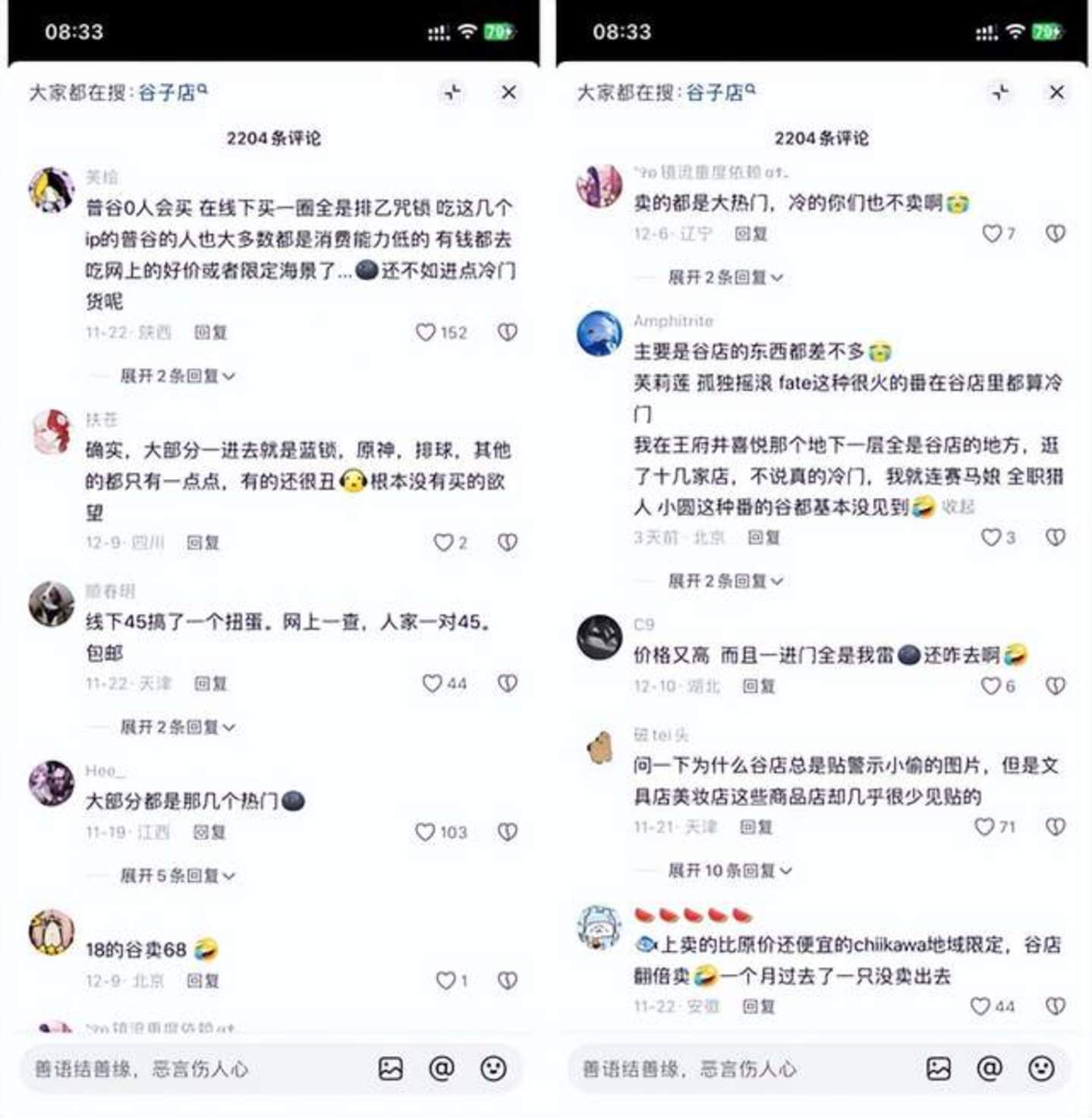 这也导致,火热的谷子经济已陷入同质化竞争中。在抖音评论区中,不少消费者吐槽称,进入谷子店大多数都是如蓝锁、原神、排球等热门IP,十几家谷子店除店名不同外,店内售卖的商品极其相似。