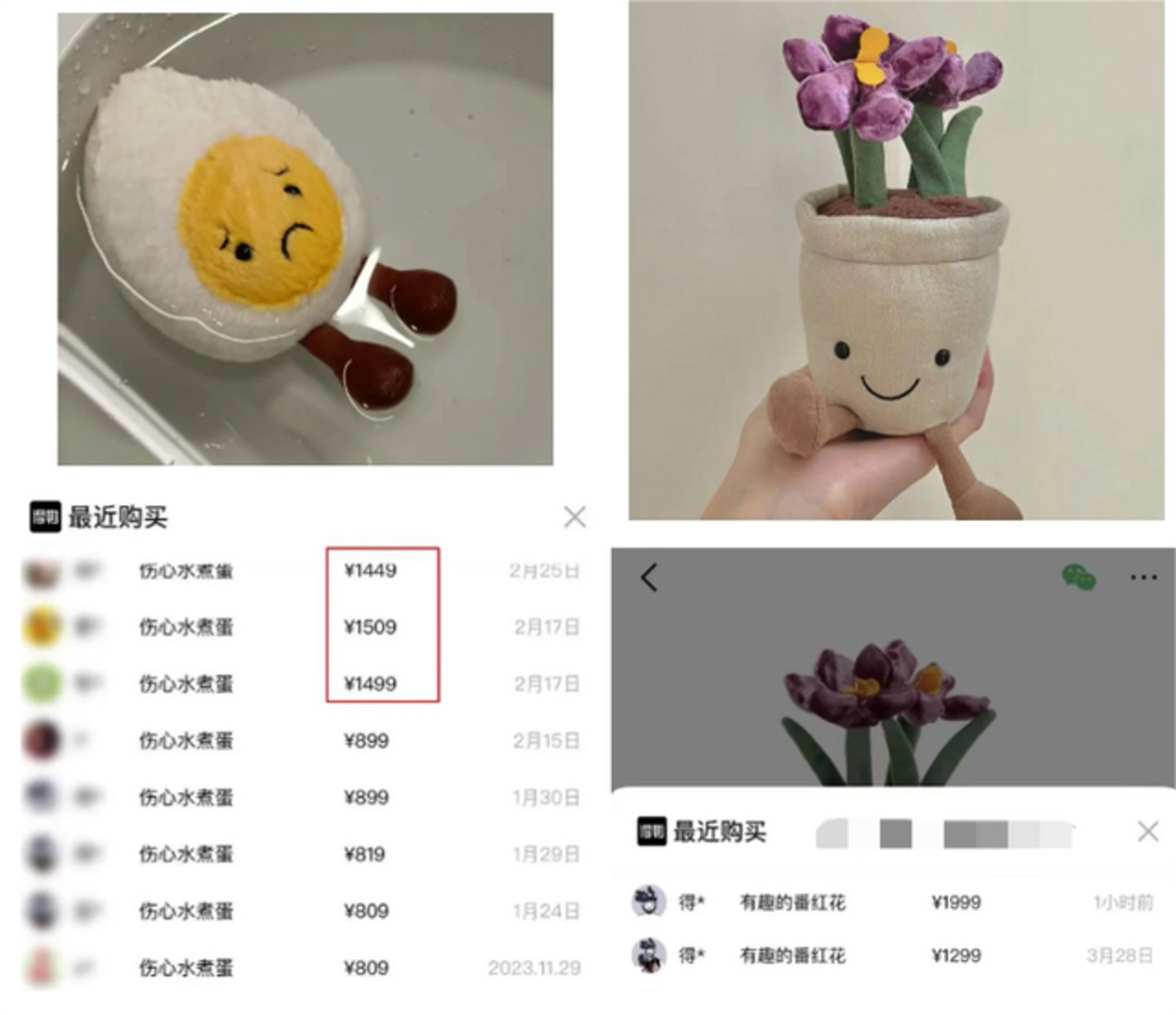 今年,Jelly Cat“伤心水煮蛋”公仔和“有趣的番红花”从299元的发售价分别上涨到1499元和1999元,5倍以上溢价让团队轻松赚几十万。