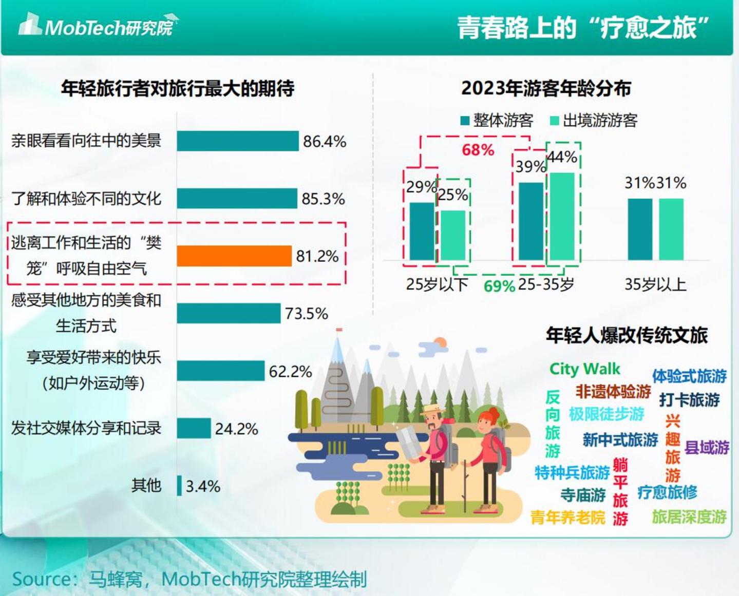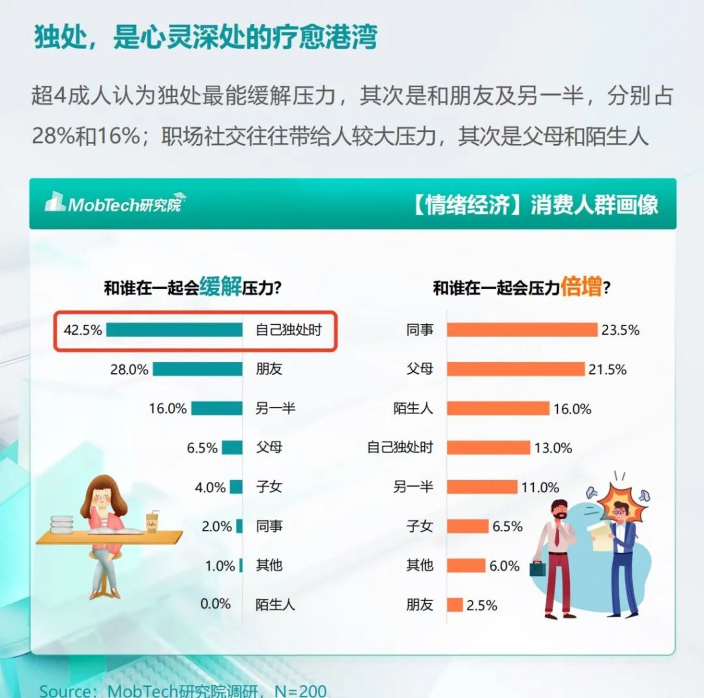 根据MobTech研究院调研的2024年情绪经济消费人群洞察显示,近一半的年轻人认为自己独处时最缓解压力,没有激烈的观点碰撞,也没有消极情绪的起伏波动,一个人的旅行成为了年轻人青春路上的“疗愈之旅”。