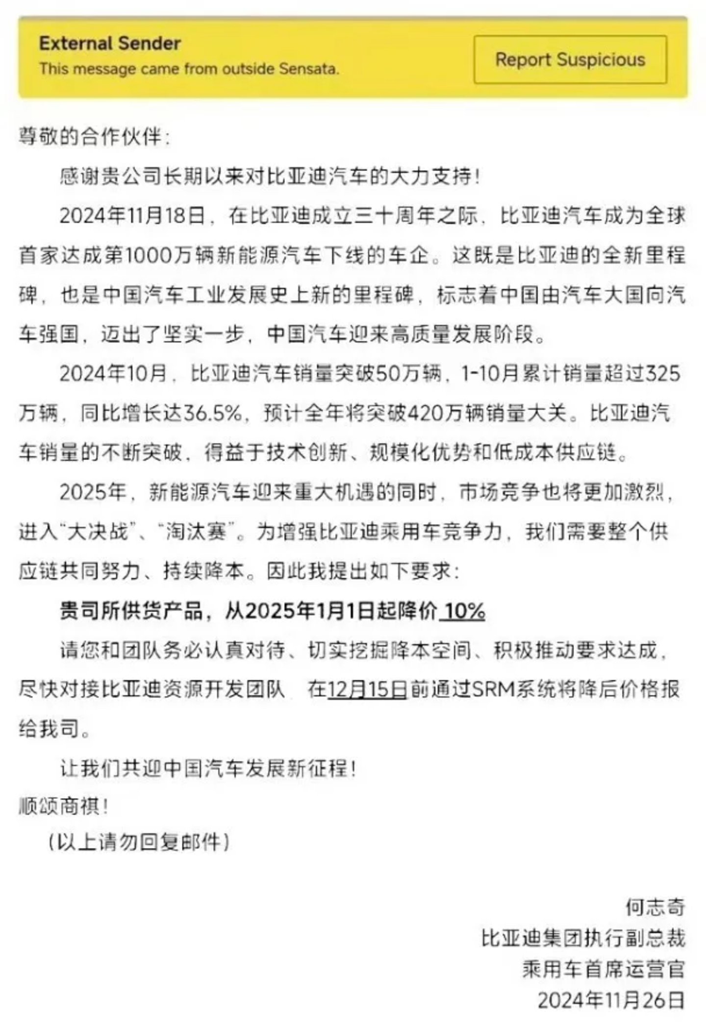 邮件落款显示,该邮件系比亚迪集团执行副总裁、乘用车首席运营官何志奇于11月26日发出。内容显示:“为增强比亚迪乘用车竞争力,我们需要整个供应链共同努力、持续降本。因此我提出如下要求:贵司所供货产品,从2025年1月1日起降价10%。”