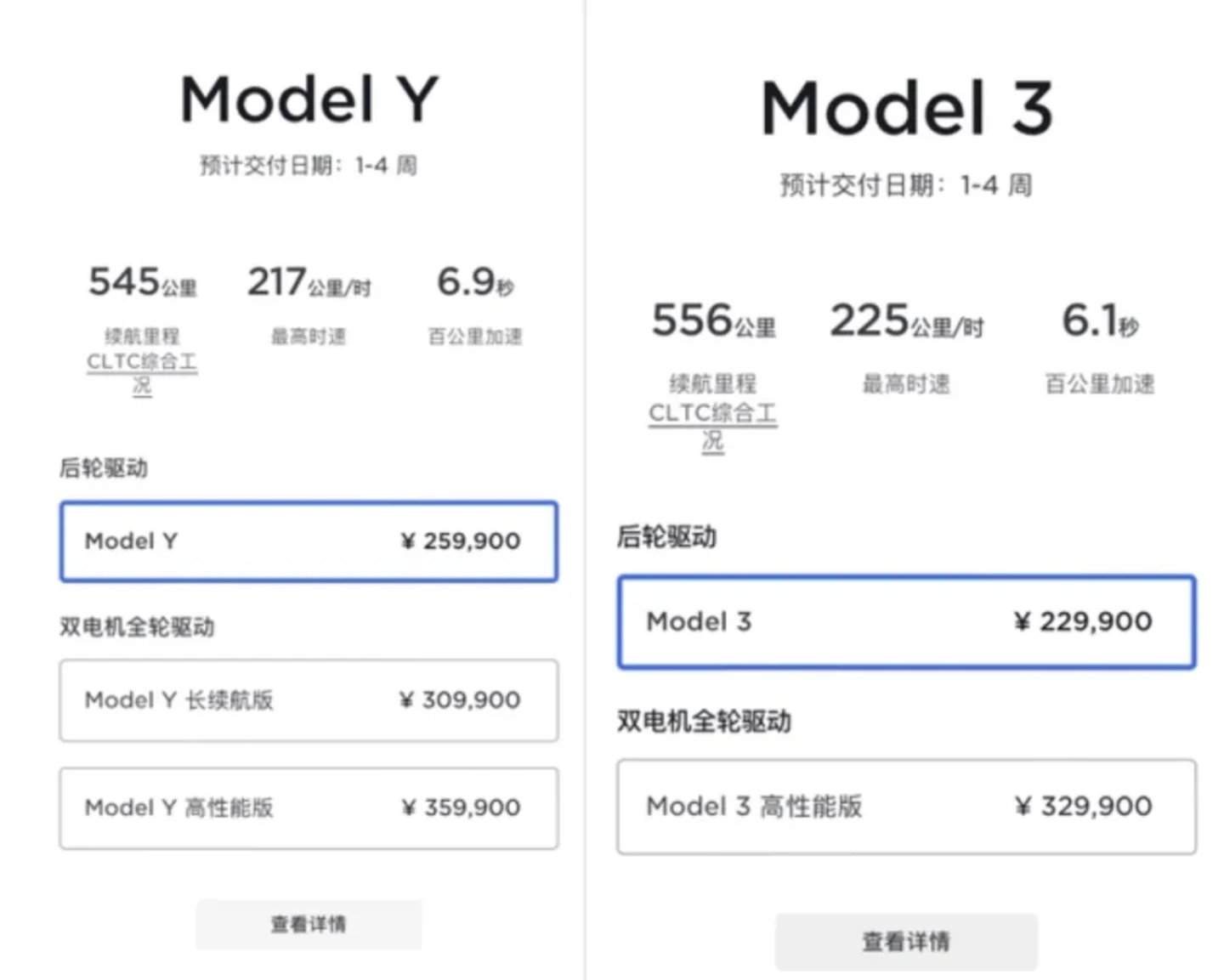 特斯拉作为行业的领军者,年初在中国市场的大幅调价堪称一场“鲶鱼效应”。1月1日,特斯拉宣布Model 3标准续航版起售价下调至22.99万元,高性能版降至32.99万元;Model Y长续航版降至25.99万元,高性能版降至28.89万元。
