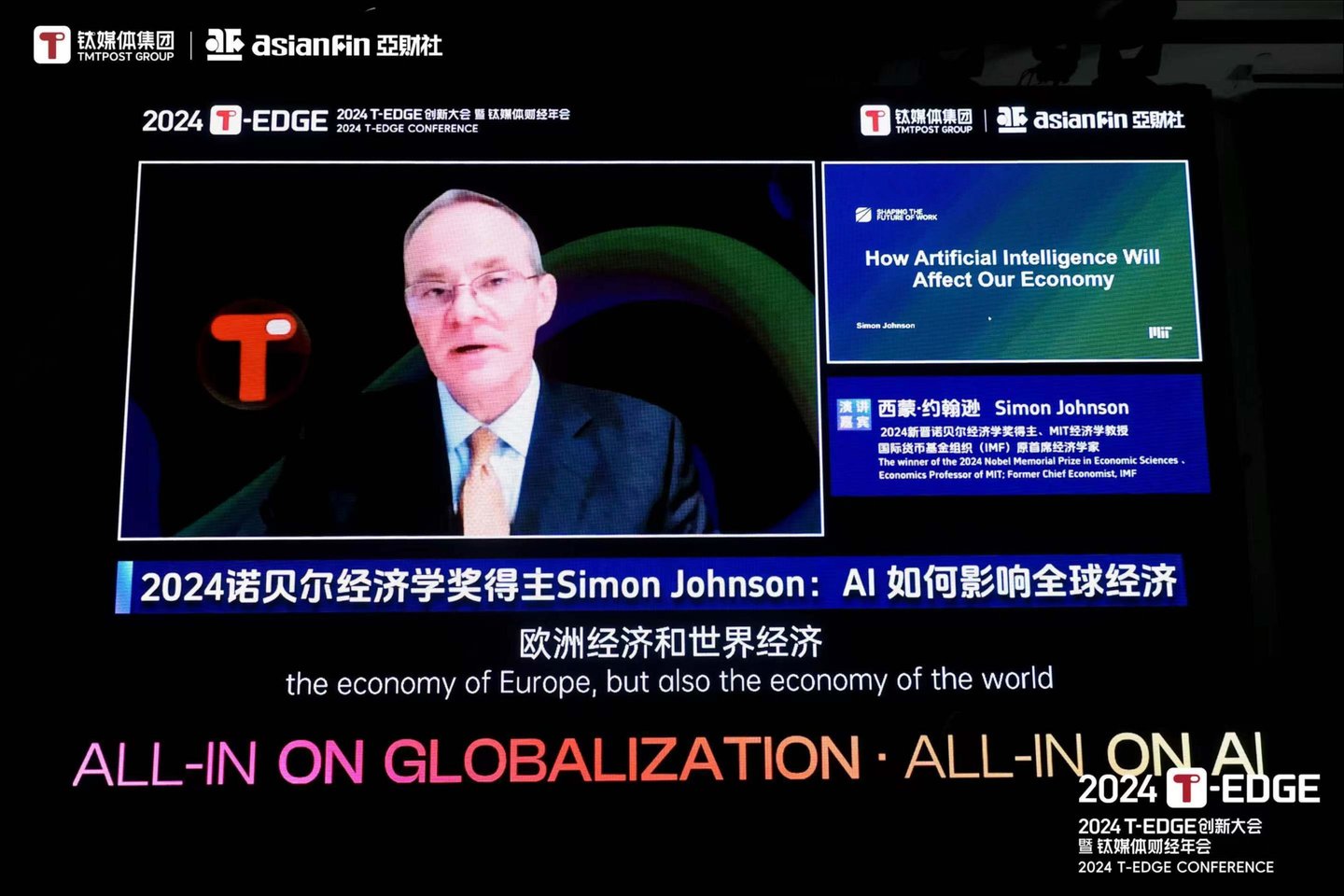 12月6日-7日,2024T-EDGE创新大会暨钛媒体财经年会在北京市大兴区举行。在闭幕演讲环节,2024新晋诺贝尔经济学奖得主、MIT经济学教授、国际货币基金组织(IMF)原首席经济学家西蒙·约翰逊(Simon Johnson)分享了《人工智能可能如何影响我们的经济》的演讲。