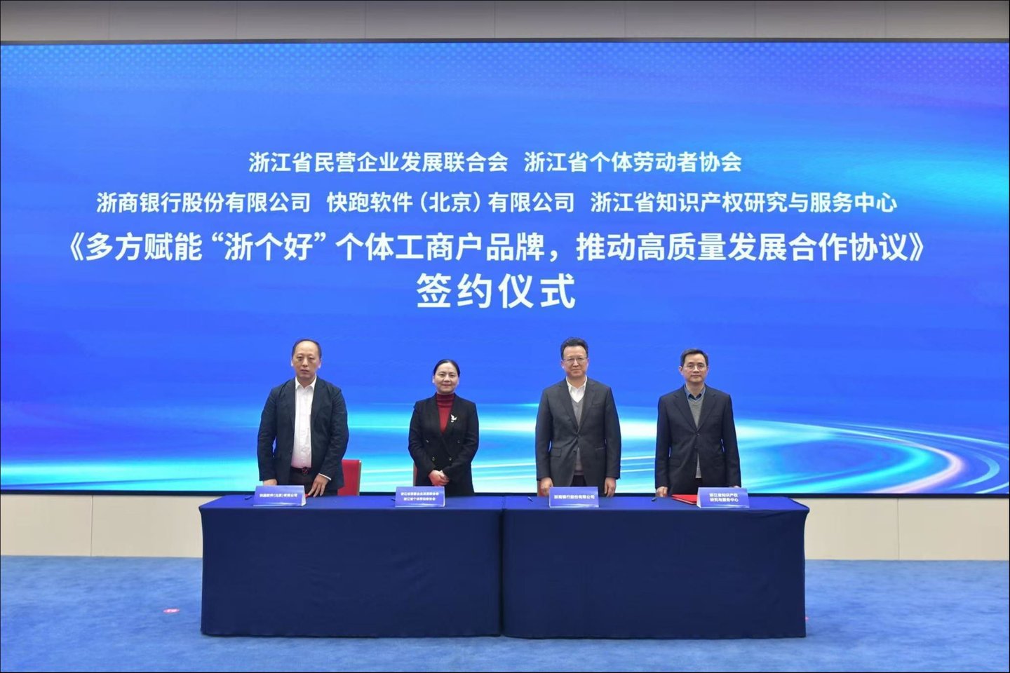 会上,浙江省个体劳动者协会、浙江省民营企业发展联合会与浙商银行股份有限公司、快跑软件(北京)有限公司、浙江省知识产权研究与服务中心举行合作协议签约仪式,多维赋能,共同推动“浙个好”个体工商户品牌建设和高质量发展。