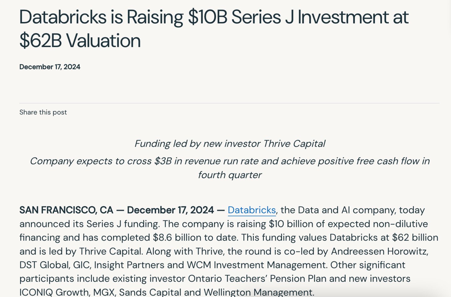美东时间12月17日,数据分析和AI平台巨头Databricks宣布将完成100亿美元J轮融资,公司估值将从此前的430亿美元攀升至620亿美元。本轮融资由Thrive Capital领投,多家知名投资机构参与本轮融资,包括Andreessen Horowitz、DST Global、GIC、Insight Partners和WCM Investment Management作为共同领投方。此外,安大略教师退休金计划、ICONIQ Growth、MGX、Sands Capital和Wellington Management也参与其中。该轮融资将用于投资于新的AI产品、收购以及大幅扩张其国际市场业务。