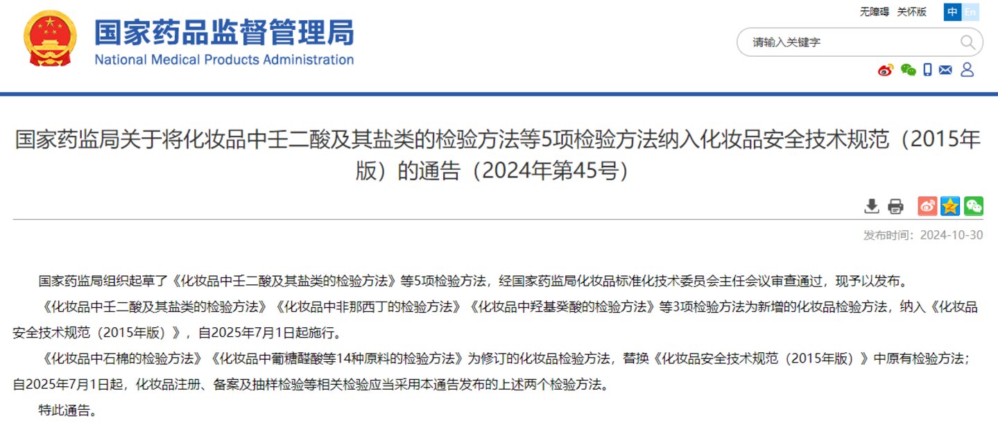 2024年10月30日,国家药监局发布《关于将化妆品中壬二酸及其盐类的检验方法等5项检验方法纳入化妆品安全技术规范(2015年版)的通告(2024年第45号)》,新增《化妆品中壬二酸及其盐类的检验方法》《化妆品中非那西丁的检验方法》《化妆品中羟基癸酸的检验方法》3项检验方法,自2025年7月1日起实施;修订《化妆品中石棉的检验方法》《化妆品中葡糖醛酸等14种原料的检验方法》两项检验方法,自2025年7月1日起实施。