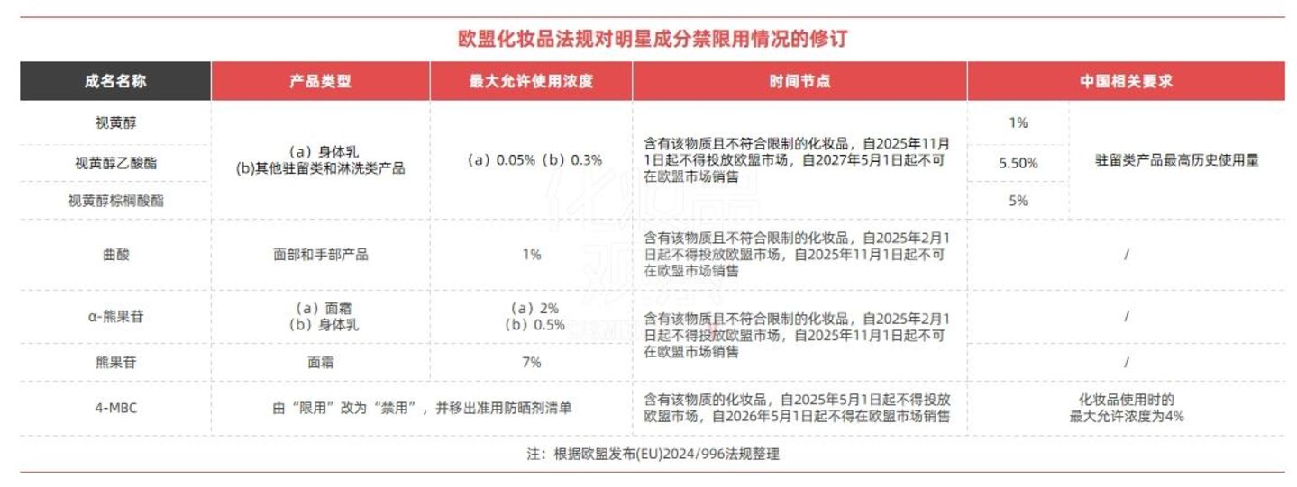 2024年4月,欧盟委员会正式公布的欧盟化妆品法规(CPR)修订案(EU)2024/996,明确将限制/禁用九种化妆品成分,其中,A醇(视黄醇)、曲酸、α-熊果苷、熊果苷被列入限用清单,4-MBC则直接被禁用,且将在明年相继结束过渡期: