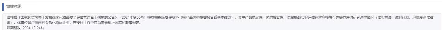 这使得不少企业备案新品碰了壁。譬如,广州某企业备案的一款产品,审核意见要求在2024年12月24日前完成整改:“提交完整版安评资料(视产品类型提交报告或基本结论),其中产品稳定性、包材相容性、防腐挑战实验评估在对应模版可先提交序时研究进展情况(试验方法、实验计划、现阶段测试结果)”,原因是“你单位是广州市的头部化妆品企业,在安评工作中应当率先执行国家的政策规定”。