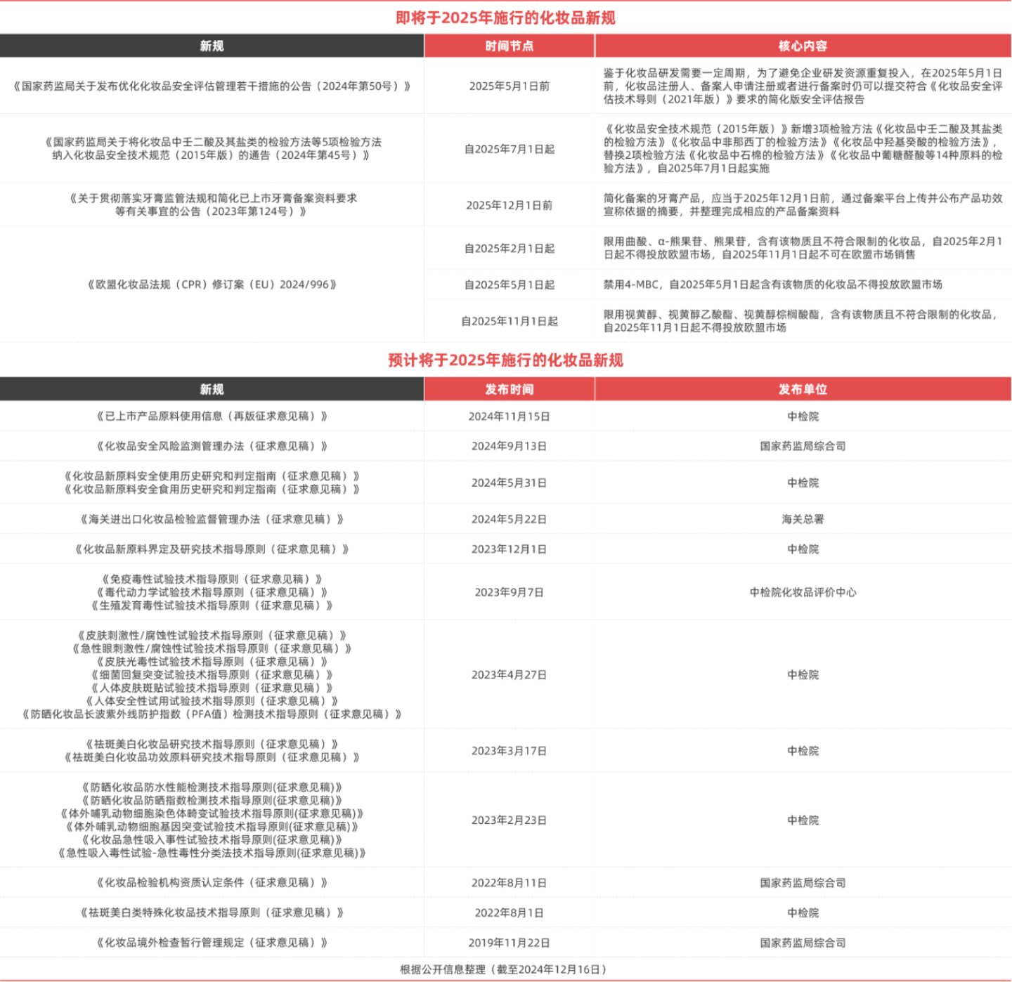 与此同时,《化妆品安全风险监测管理办法(征求意见稿)》等二十余部新规呼之欲出,大概率将在2025年落地执行,也就是说,化妆品企业头上的“紧箍咒”将进一步收紧。