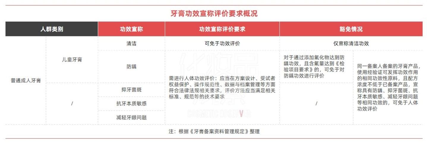 按照要求,除了特定的豁免情况,牙膏备案人按照国家标准、行业标准进行功效评价后,方可宣称防龋、抑牙菌斑、抗牙本质敏感、减轻牙龈问题等功效。其中,儿童牙膏可以宣称的功效类别仅限于清洁、防龋。