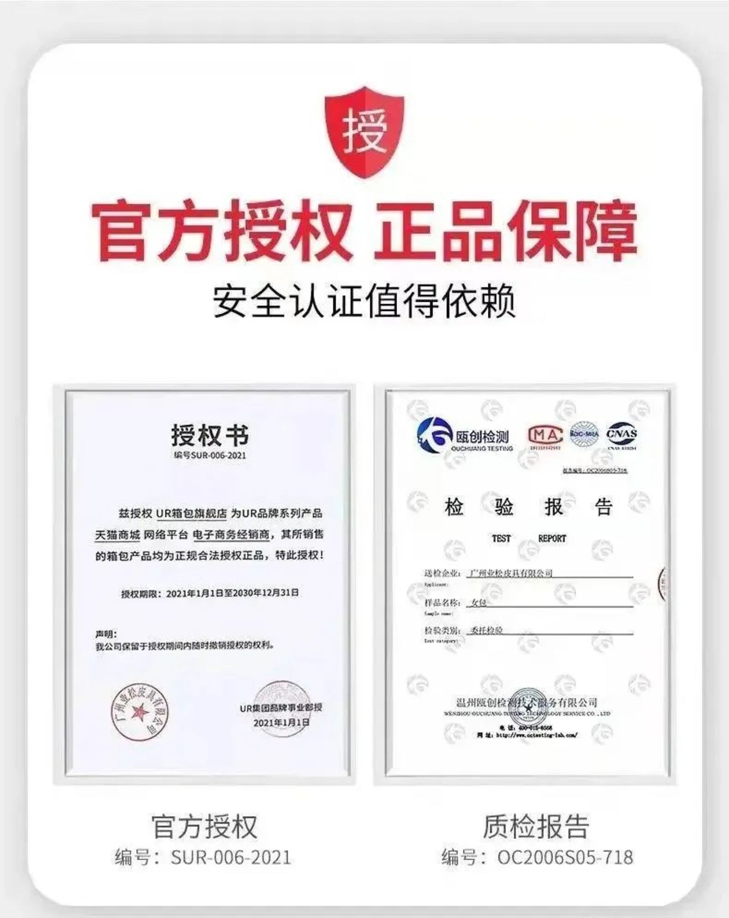 有的旗舰店怕你怀疑,详情页还专门放了张官方授权图,赌的就是你不会仔细看。例如,授权方是业松皮具公司,被授权方是UR箱包。