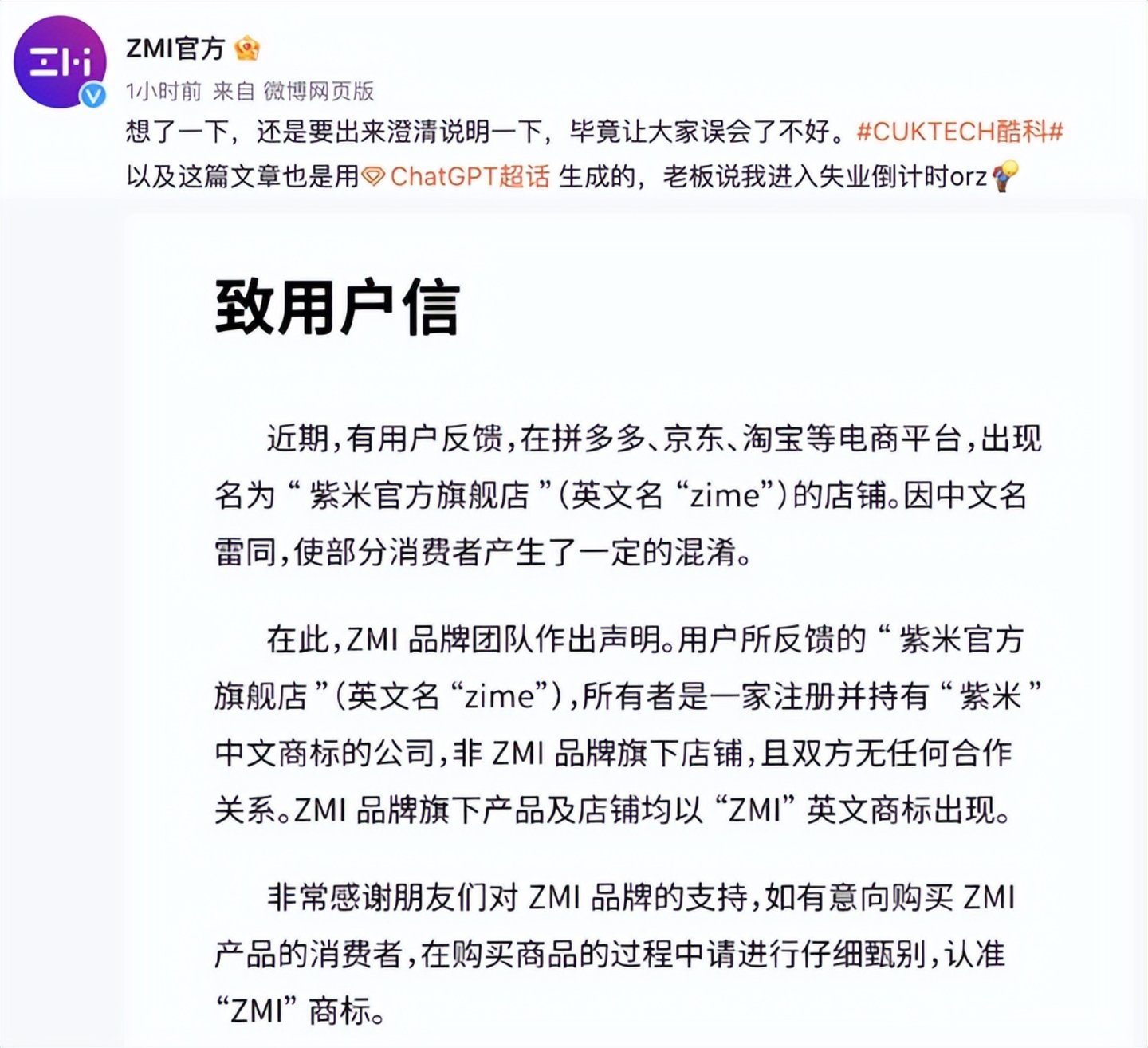 从2021年,美国ColourPop公司特地注册新浪微博澄清“品牌在国内没有淘宝/天猫/京东旗舰店、微信微店、中文官网或是开设线下店铺”,再到2023年,小米旗下ZMI品牌团队发布声明称:“紫米官方旗舰店所有者是一家注册并持有‘紫米’中文商标的公司,非ZMI品牌旗下店铺,且双方无任何合作关系。”李鬼旗舰店越来越猖狂,倒逼正版发声,白白送了波“泼天的流量”。