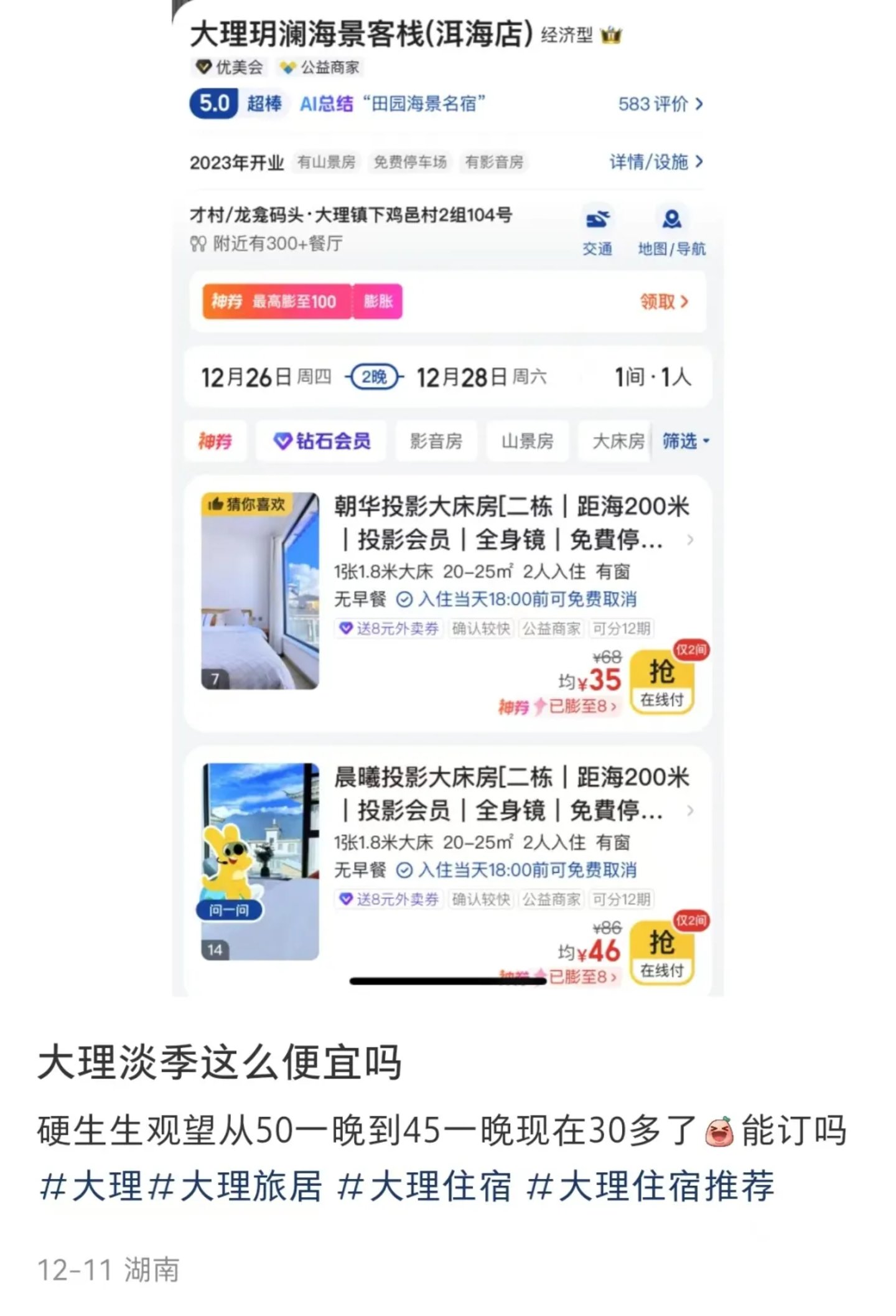 不过,玲姐绝对想不到,现在大理民宿的价格都卷到3开头的两位数了。