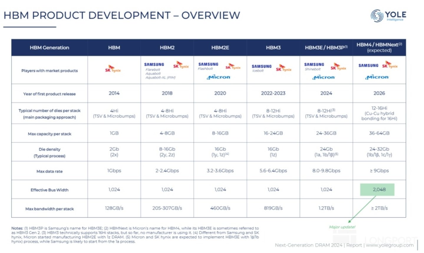 对于市场关注的 HBM 领域,当前行业龙头三家厂商的产品都已经迭代到最新的 HBM3E,其中海力士和公司的产品已经供货英伟达。根据 YOLE 预计,HBM 产品将在 2026 年迭代至下一代的 HBM。