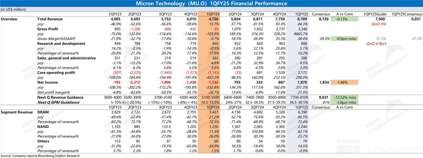 1、总体业绩:收入端达标,毛利率遇阻。美光公司 2025 财年第一季度总营收 87.1 美元,同比上升 84.3%,符合市场预期(87.2 亿美元)。本季度收入继续加速回升,是受公司 DRAM 业务增长的带动。美光公司在 2025 财年第一季度实现净利润 18.7 亿美元,利润端持续提升。在 HBM 放量及存储产品价格上涨的推动下,公司收入端和毛利率都有明显的提升,推动公司最终利润的明显好转。