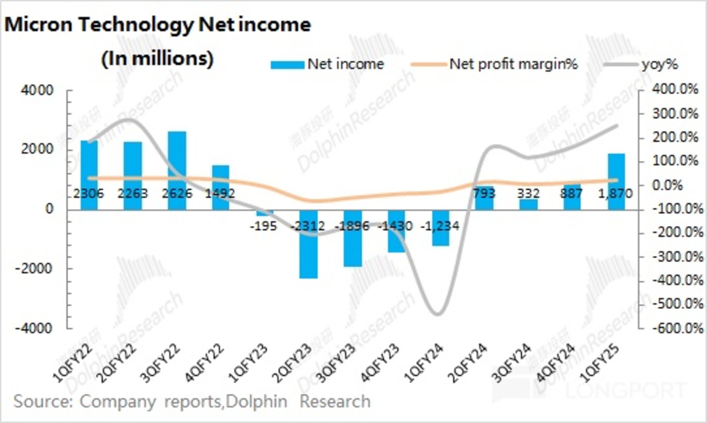 美光公司 2025 财年第一季度实现净利润 18.7 亿美元,符合市场预期(18.3 亿美元)。公司本季度的利润增长,主要得益于 DRAM 的业务增长以及毛利率的提升。而在本季度,公司净利率为 21.5%,盈利能力提升明显。其中公司本季度的经营性利润达到了 21 亿美元,已经达到了过往周期中相对较高的位置。