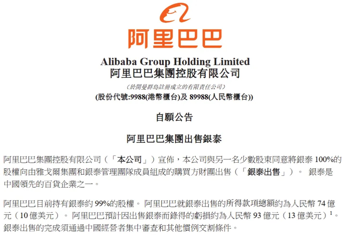 值得一提的是,阿里巴巴预计出售银泰商业的打包价约为 74 亿元,这次降价出售将产生约 93 亿元亏损。