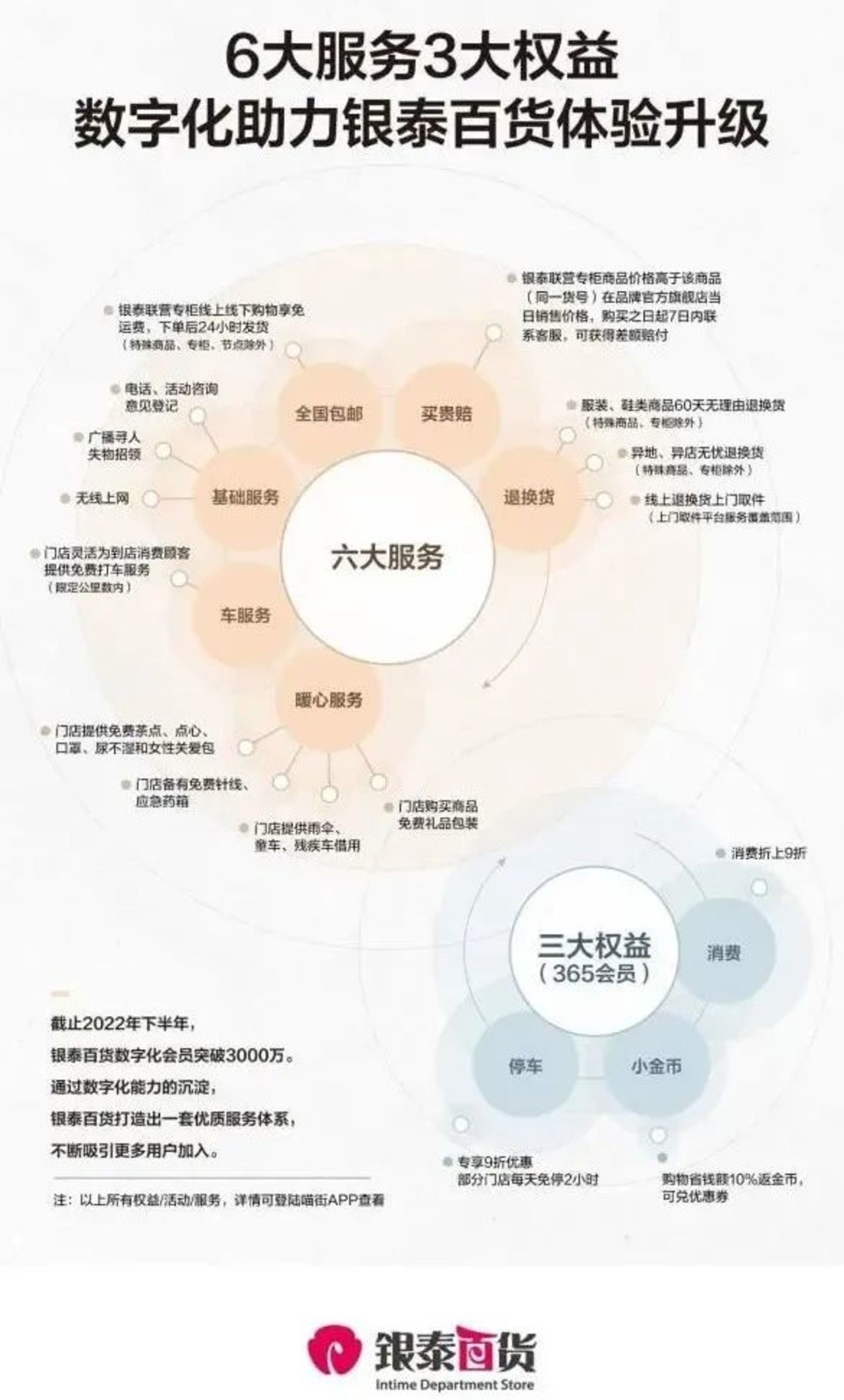 而在阿里的助力下,银泰的数字化转型和即时零售模式也得以快速落地,不仅在线上实现了喵街APP、“银泰百货INTIME”微信小程序、“银泰百货”支付宝小程序等全渠道销售,还建立了中国首个百货业付费会员体系INTIME365,推出了“定时达”服务,其旗下八成门店最快1小时定时达。