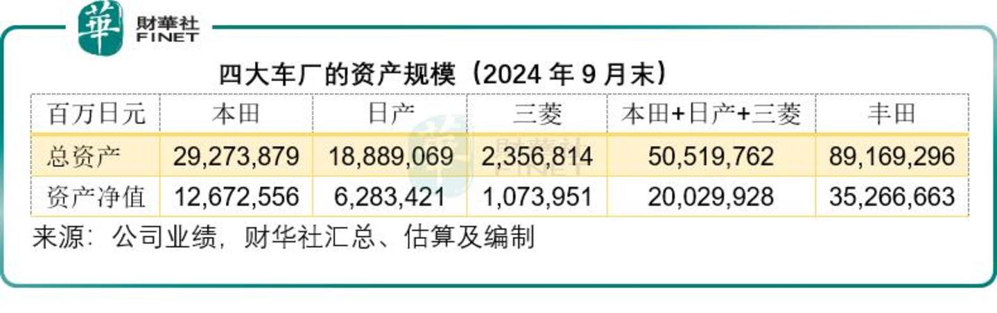 不过,就2024年9月30日的资产规模与资产净值规模来看,三家车厂合并的规模仍仅相当于丰田的57%左右,能否实现规模化效益或取决于其协同效应有多大。