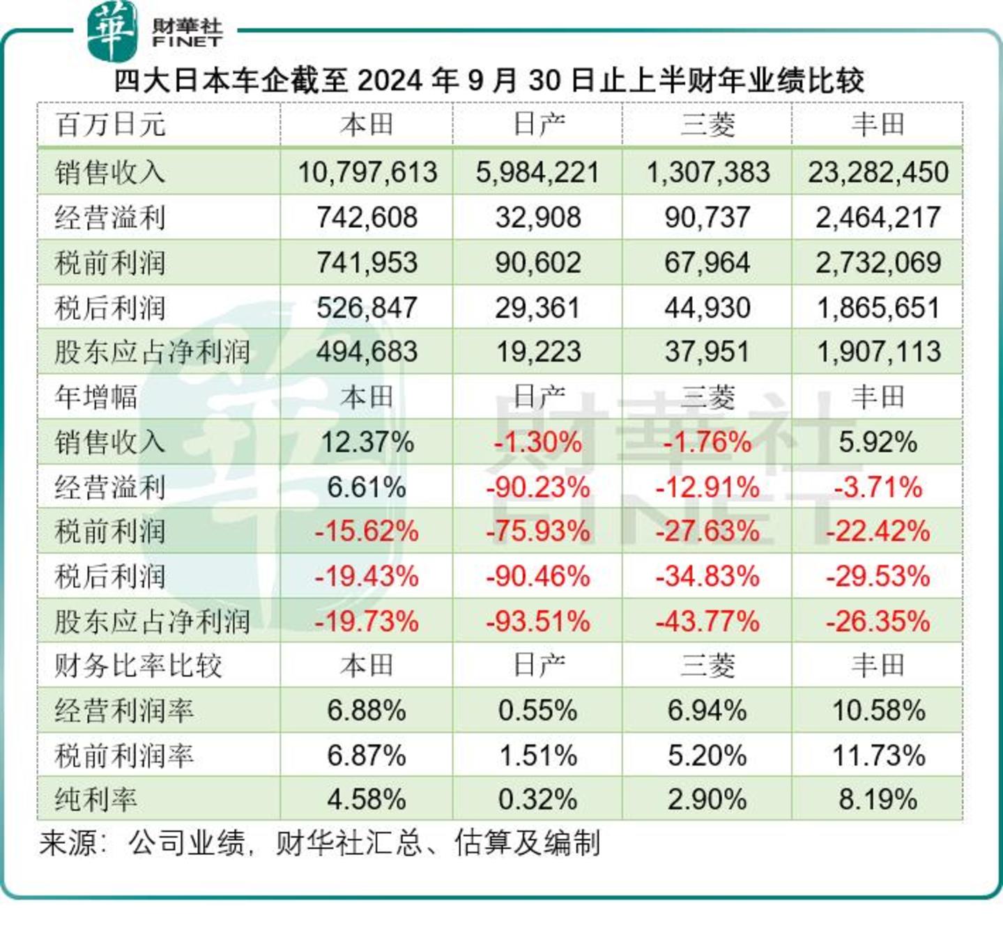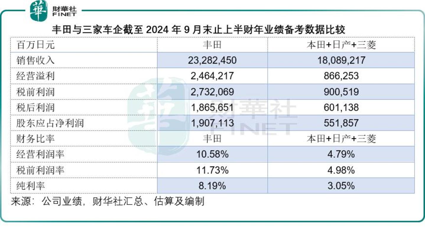 于截至2024年9月末止的上半财年,不论是本田、日产、三菱,还是丰田,都面临利润下降的压力,见下表。