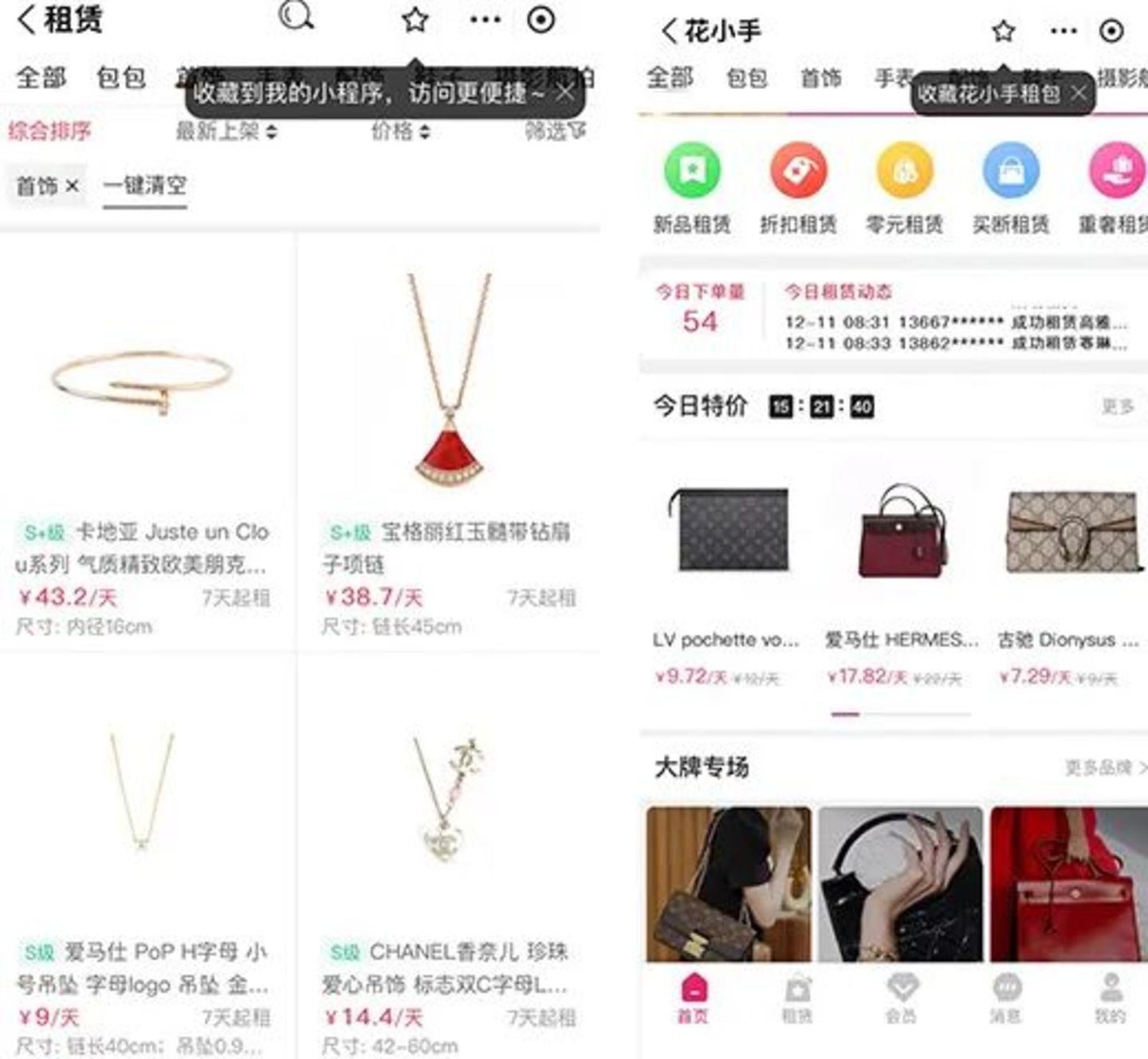 除了买卖,二手租赁也在一些互联网平台兴起。在支付宝上,超过50万人使用过的某小程序里,17.82元可以体验爱马仕入门款包一天,38.7元就可以租到一条售价大几万的宝格丽项链。