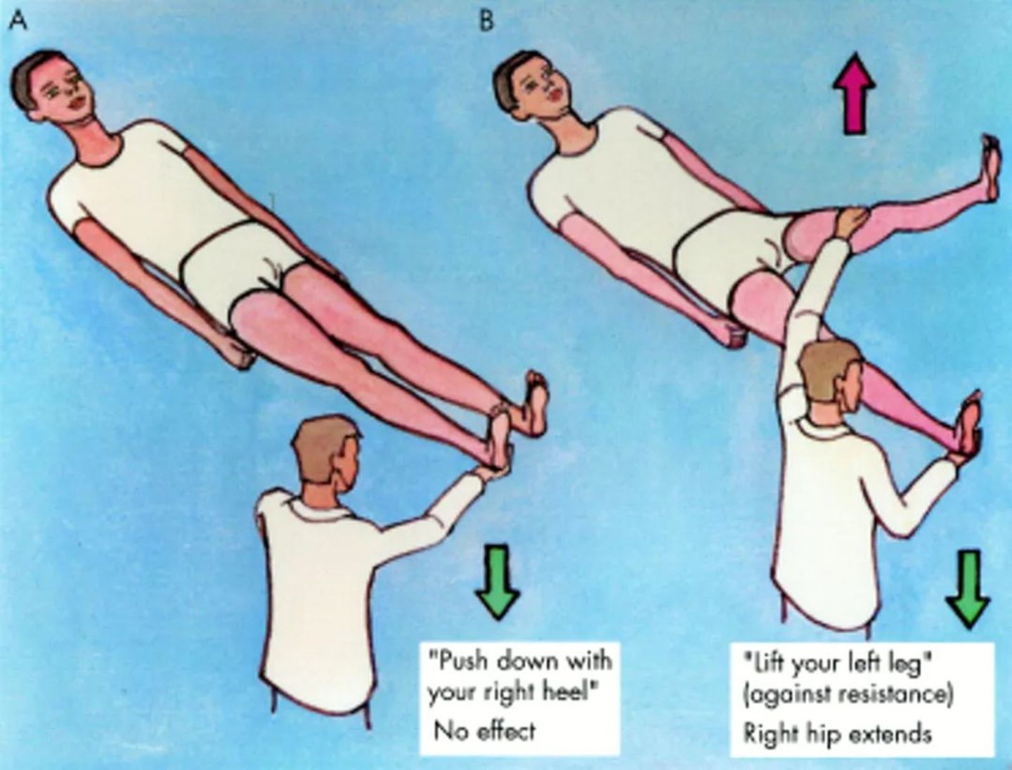 医生要求患者用另一条未受影响的腿做某个动作,同时检查另一侧(受影响的一侧)的施力情况。在正常情况下,抬起左腿会引起对侧臀部的伸展,并使右脚后跟向下施压,这是一种典型的交叉效应。在结构性右腿无力的情况下,这种交叉效应缺失,因为右腿无法做出反应。但如果无力是功能性的,患者会不由自主地使用受影响的腿,仍然施加后跟压力。医生的请求将注意力转移到未受影响的肢体上,从而揭示了受影响肢体保存的生物力学能力[47]。