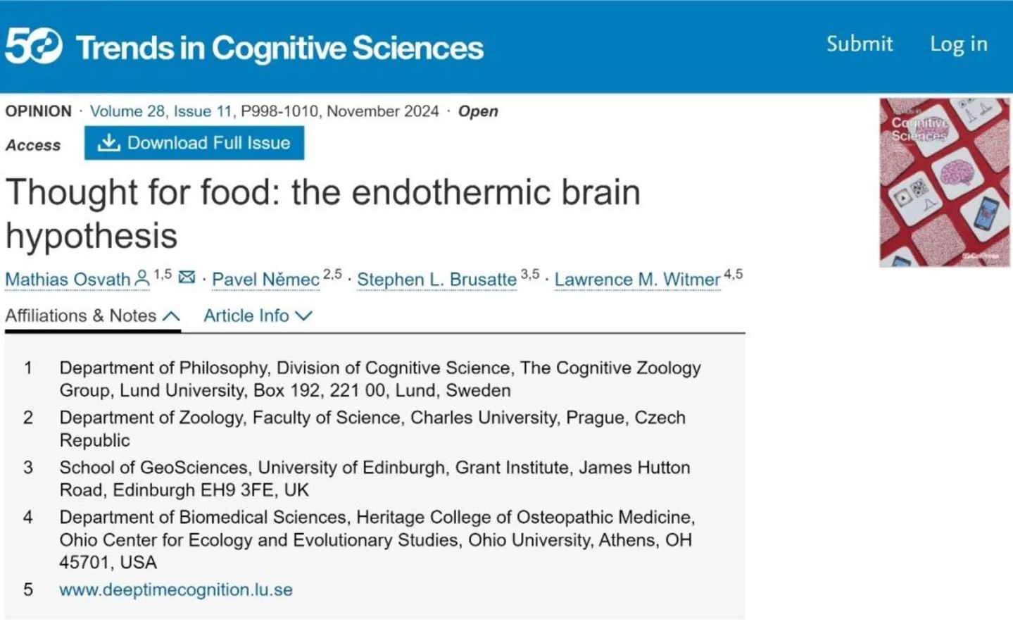 ▷ Osvath M, Němec P, Brusatte SL, Witmer LM. Thought for food: the endothermic brain hypothesis. Trends Cogn Sci. 2024;28(11):998-1010. doi:10.1016/j.tics.2024.08.002.