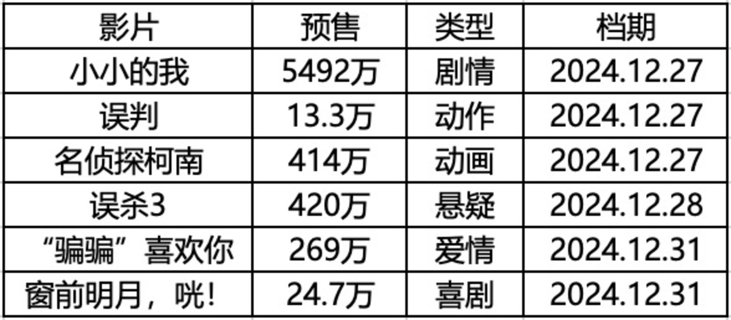 很显然,今年跨年档会相对不错。虽然目前整体体量和数量都不错,但其上限在于《小小的我》跟《误杀3》的发挥,两部影片直接决定着跨年档整体的市场想象力,也是最为关键的两部种子电影。因此,两部电影的一举一动,无疑都牵扯到整个大盘和档期的格局。而后续的影片能否跟随提档,也是接下来的一大看点。