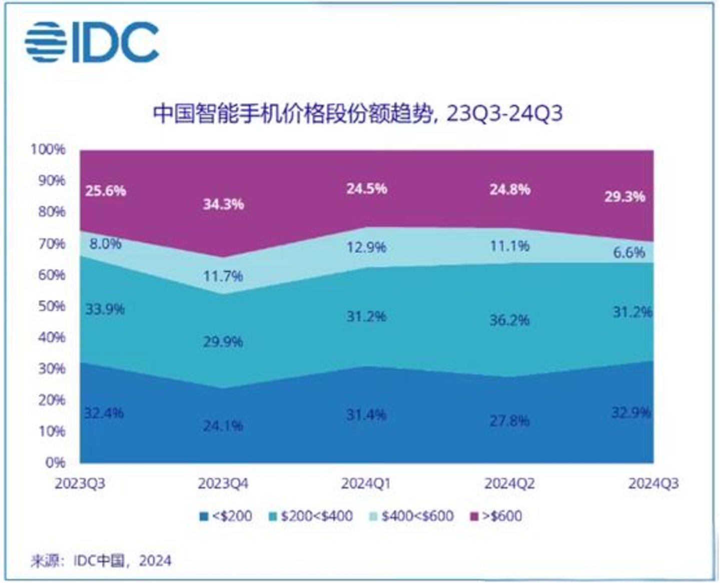 根据IDC最新的报告显示,到2025年时,中国智能手机市场600美元以上的市场份额预计将达到30.9%,同比增长2.1%;而200美元以下的市场份额也将同比增长2.1%,达到31.5%。